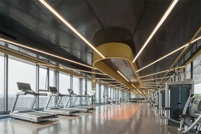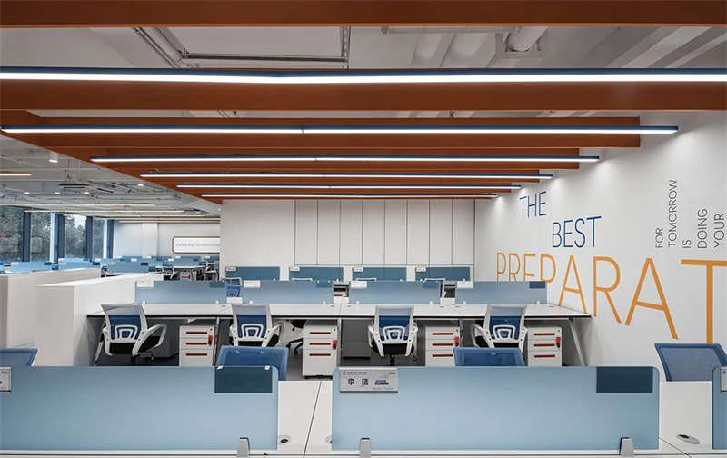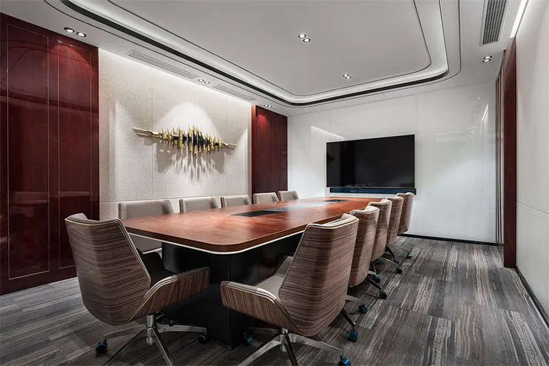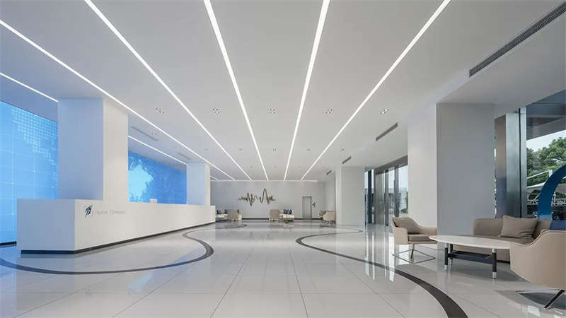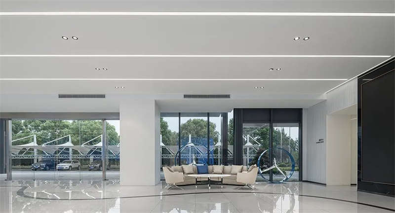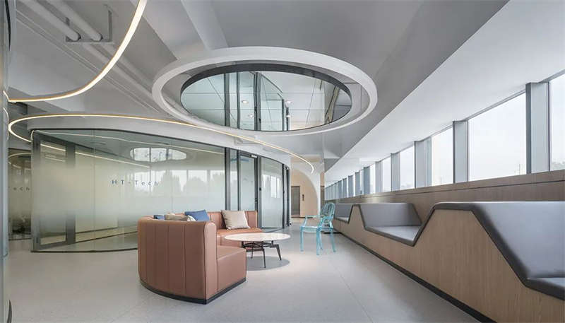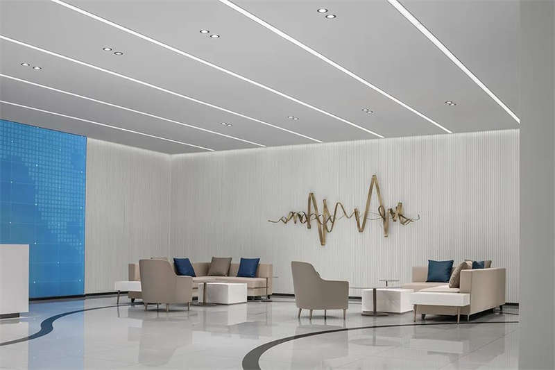 前厅顶部,镜面质感与光带反射,使空间得到延伸、重叠呼应,营造出多维的视觉效果,同时打破科技办公室设计的刻板印象,拥有宽敞开放的前台设计、待客区,层次、质感、丰满而厚重。