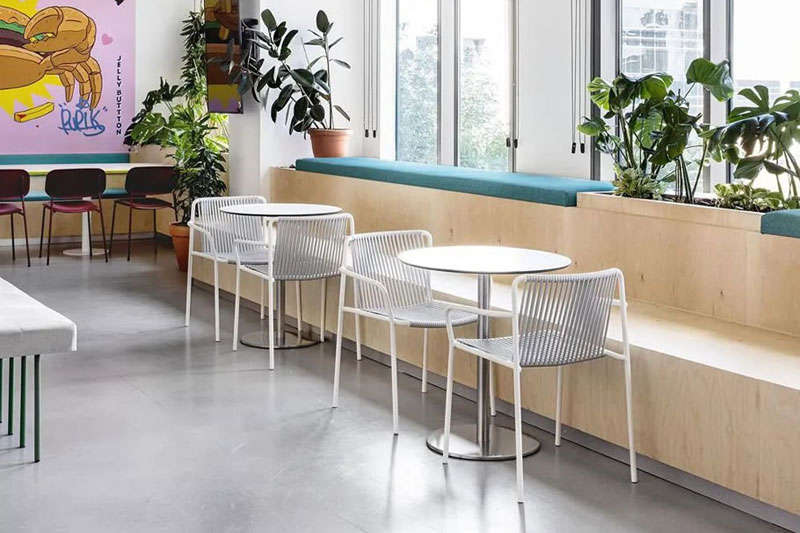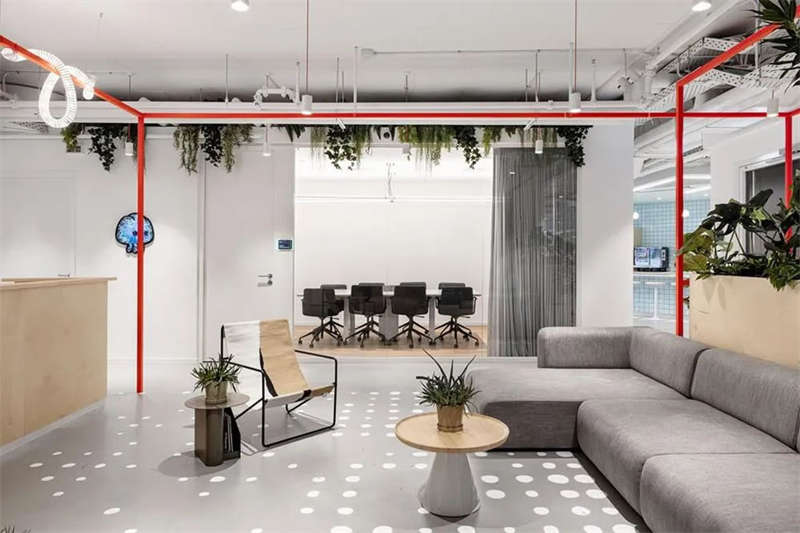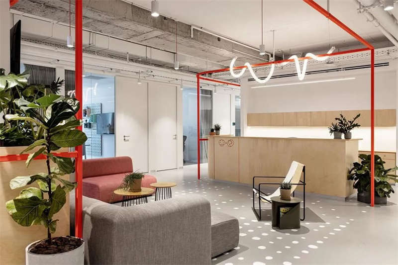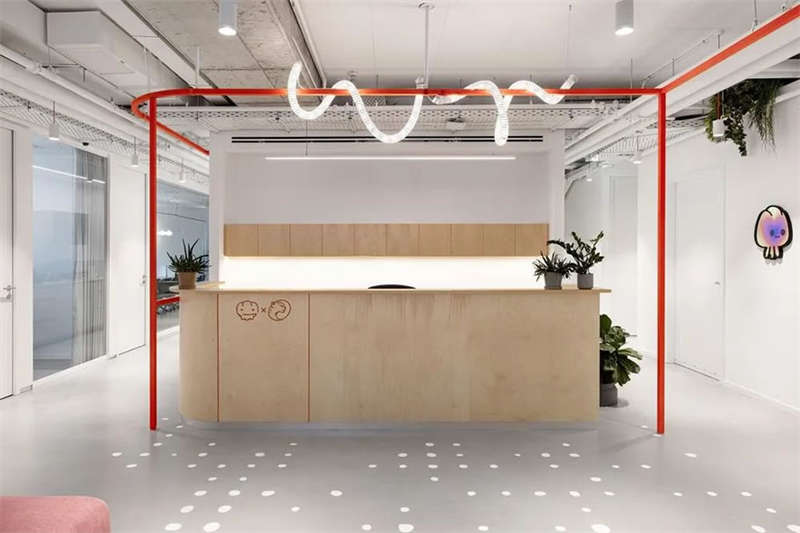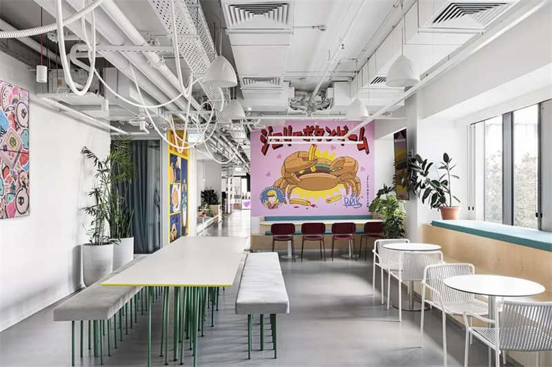 本案的设计出发点旨在创建一个独特的空间体验。在以混凝土、裸露的白色天花楼板、绿色植物、天然木材和白色金属构筑的中性调空间背景中,注入跳跃的色彩和卡通图形设计去展现其设计理念。