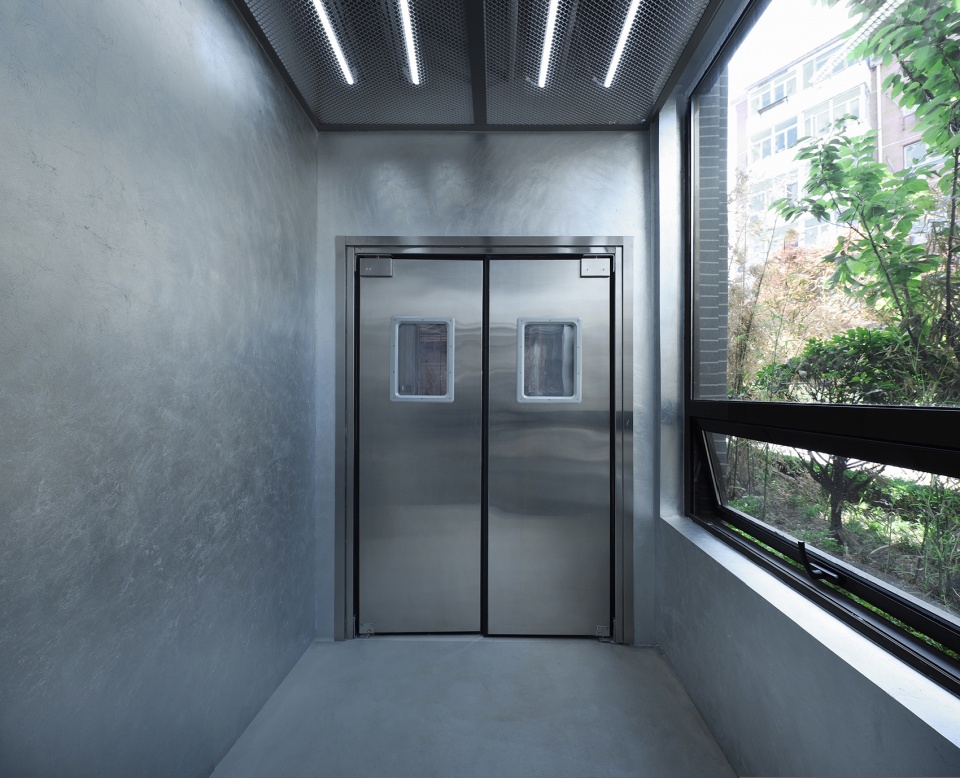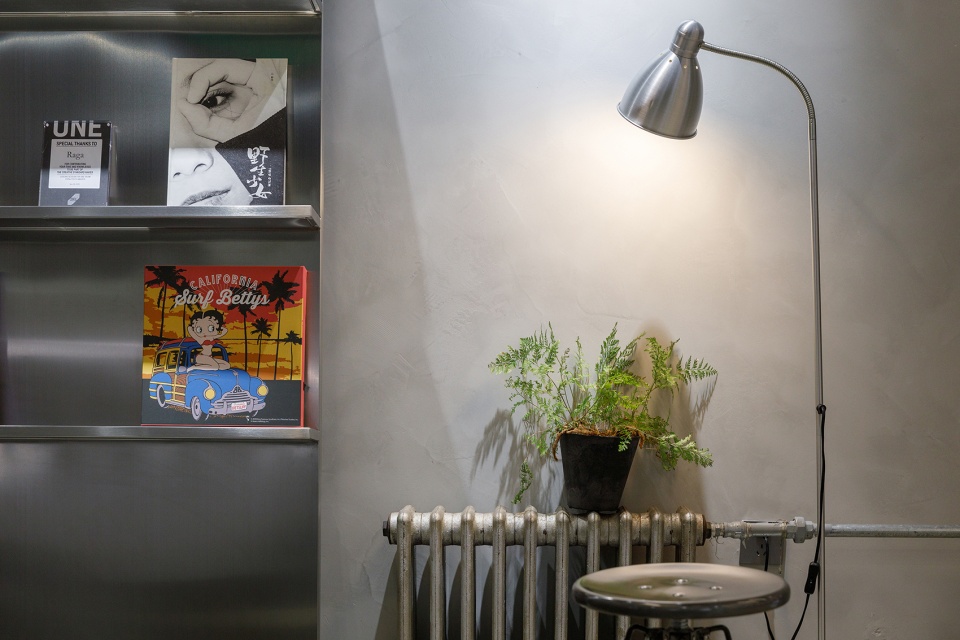 空间有两个入口,主入口保证通行和展示,次入口则作为一个工厂的精神象征。设计师采用工厂车间金属推拉门和防撞门作为工厂的大门,将粗犷锐利的工业感发挥到极致。前厅四壁贴有银箔,作为对电影《Factory Girl》的致敬。
