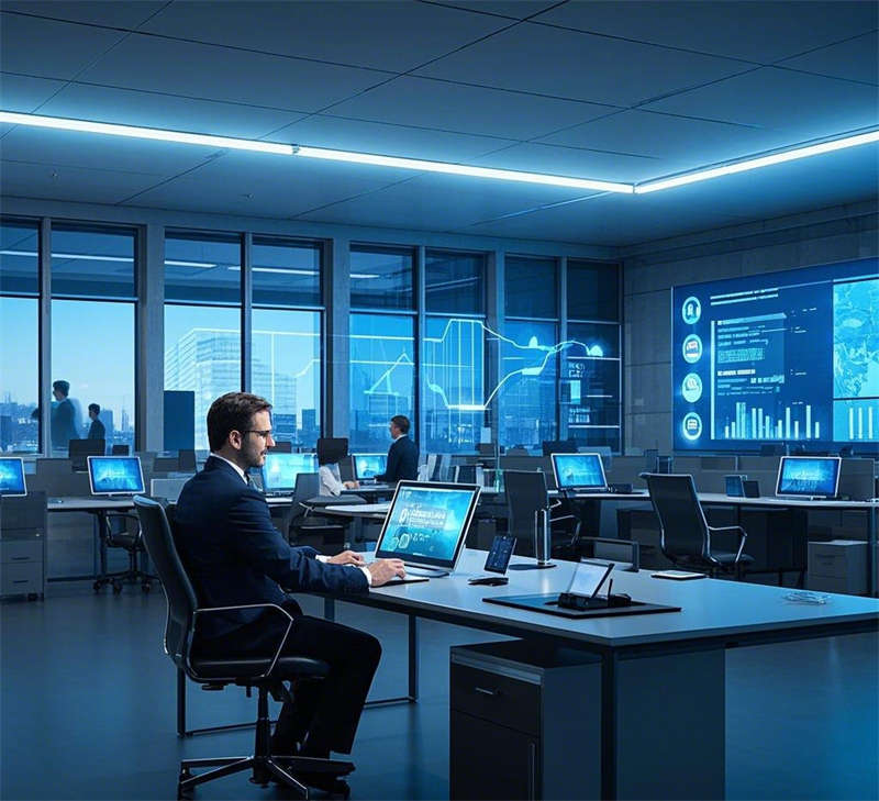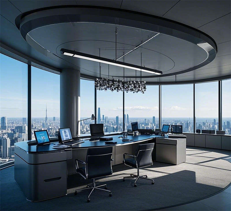 前台接待室以悬浮式前台和全息投影动态logo为核心,金属质感墙面与灯光效果结合,营造出未来之门的第一印象。敞开式办公室通过数据流全息屏幕和智能办公桌,打造高效协作的数字化办公环境。经理办公室采用全景落地窗和智能办公系统,简约大气,兼顾商务与舒适。总裁办公室位于顶层,全景视野与奢华材质相得益彰,艺术装置彰显领导风范。