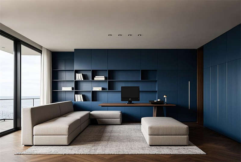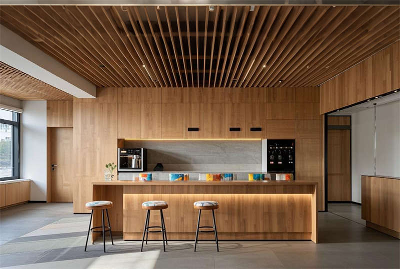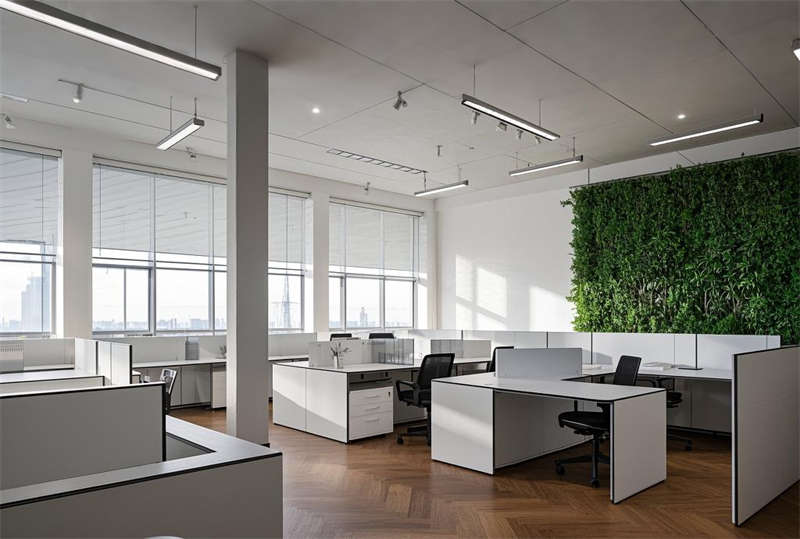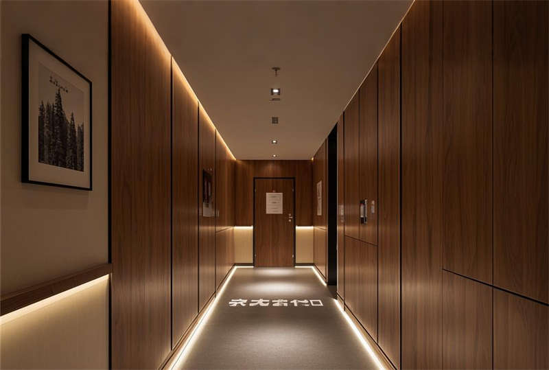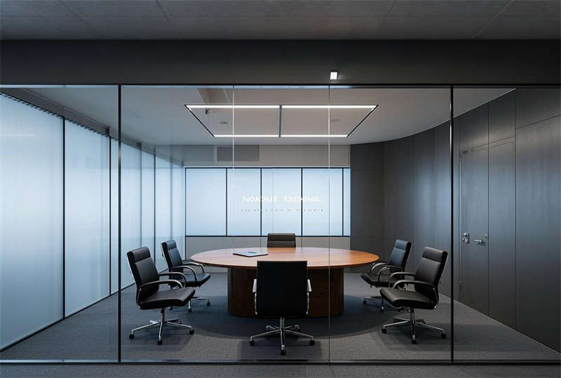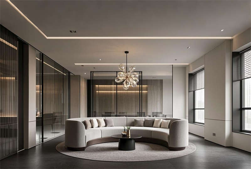 本方案采用现代简约设计语言,整体空间以浅灰、白、原木三色为主基调。前台区设置悬浮式接待台与发光LOGO墙,搭配LED线性照明塑造企业形象。开放式办公区采用模块化工位布局,通过玻璃隔断划分功能区域,保证自然采光最大化的同时提升空间通透感。智能会议系统集成于各会议室,配备电动投影和书写玻璃墙。经理室采用深蓝色烤漆木饰面提升商务质感,休息区设置咖啡吧与卡座强化员工关怀。走廊运用导视灯带串联各区域,茶水间六角地砖增添趣味性。培训室阶梯式布局配合吸音墙面确保声学效果,电话间磨砂玻璃立方体兼顾隐私与采光。VIP室智能雾化玻璃实现空间灵活转换,整体设计注重功能分区与人文关怀的平衡。