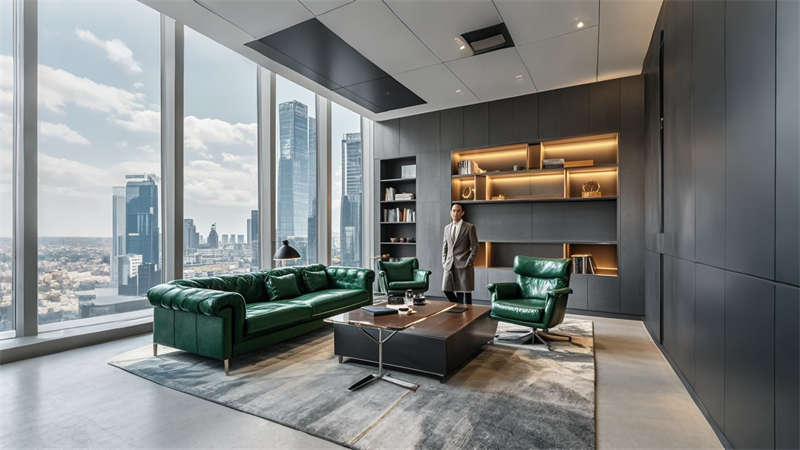 色彩体系以冷灰为主基调,局部运用墨绿、深蓝跳色,通过绒面、金属、玻璃不同材质的反射与漫射形成丰富层次。空间规划注重功能性延展,会议室配置可移动隔断系统,实现 4 种空间组合形态。员工休憩区创新采用垂直绿植墙结合智能新风,PM2.5 实时监测显示系统保障健康环境。
