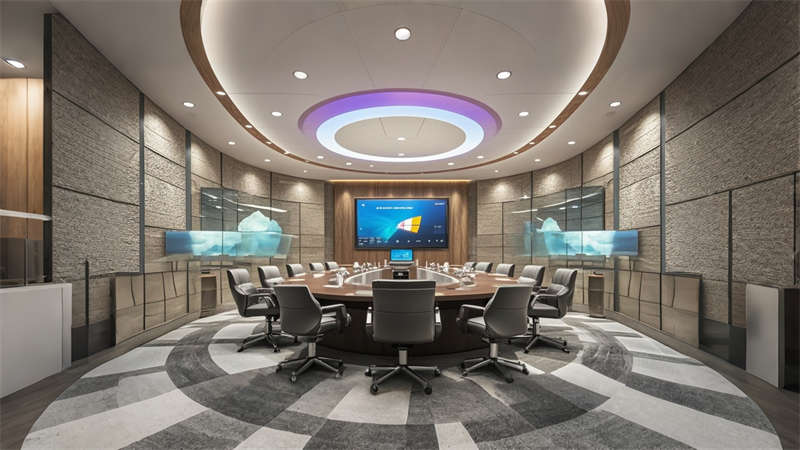 本案为 1600㎡现代科技企业总部设计,采用 ' 智慧办公・人文关怀 ' 核心理念。空间规划上,前厅 - 办公 - 会议三大模块通过环形动线串联,采用 7:2:1 的黄金面积配比。色彩系统以企业标准色太空灰为主调,搭配深海蓝企业色与原木色中和科技感,点缀活力橙提升空间温度。