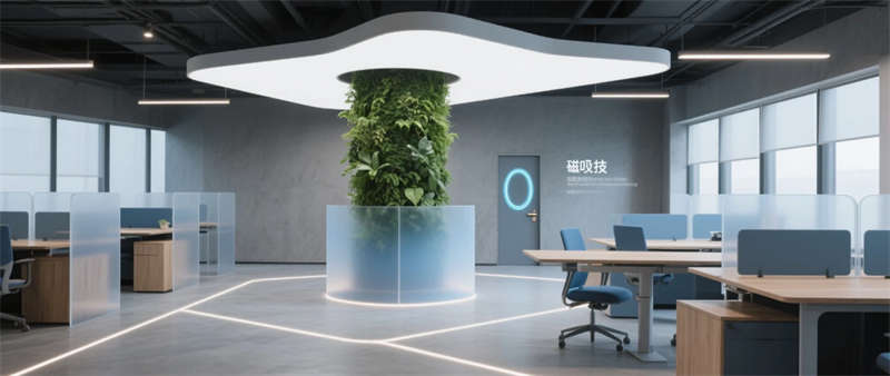 本项目以“未来生态办公”为核心理念,打造1200㎡科技与自然交融的创新型办公空间。设计采用哑光太空灰为主基调,通过雾霾蓝企业色与原木纹理的碰撞,在冷峻科技感中注入人文温度。空间以微水泥地面为基底,贯穿透光亚克力与阳极氧化铝材质,配合隐藏式线性灯带的流动光影,构建出具有呼吸感的数字美学场域。