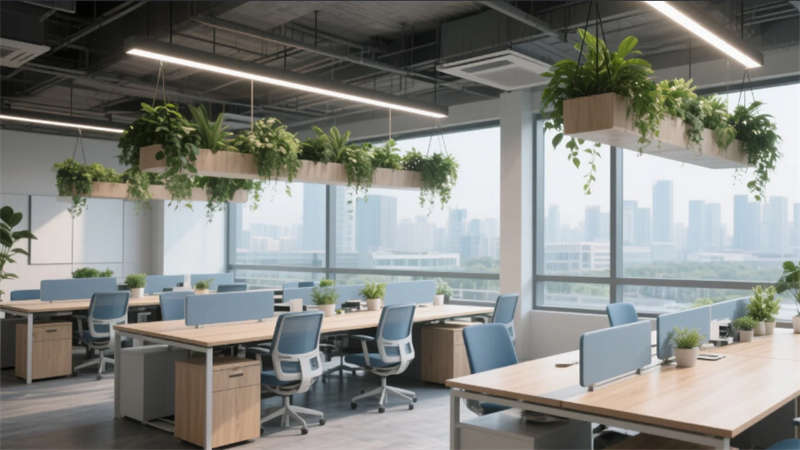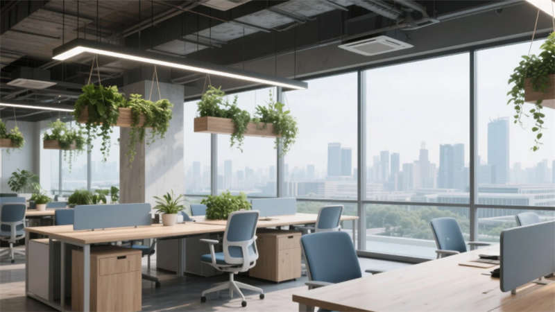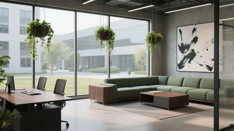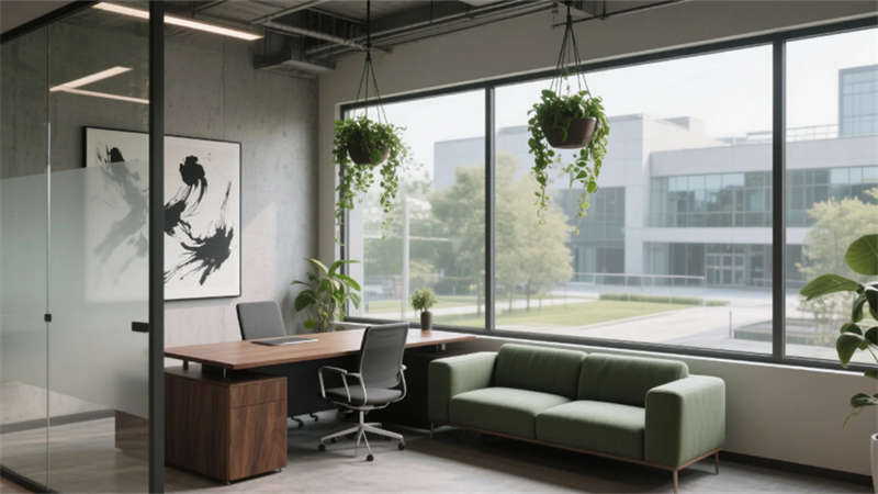 该办公空间以"自然共生"为核心理念,将科技感与人文温度融入两千平米的开放场域。流动的浅木色调贯穿始终,哑光金属与微水泥形成质感对话,模块化家具构建灵活场景。绿植生态系统从空中吊篮蔓延至苔藓墙面,模糊室内外界限。