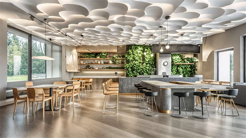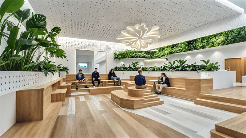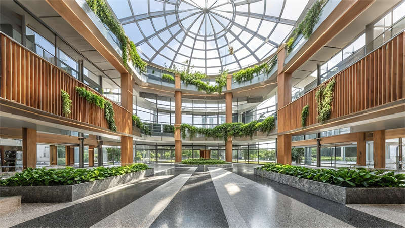 1)中庭三层挑空绿植墙构建垂直生态系统,改善室内空气质量;