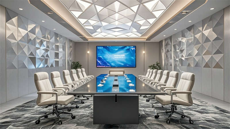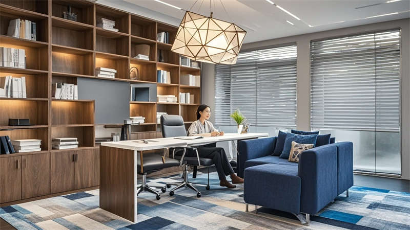 智能系统集成包括电动百叶帘、会议预约系统、环境监测显示屏等科技元素,茶水间与休息区特别设置空气净化绿植墙。灯光设计采用3000K-4000K色温可调系统,走廊采用线性引导光带提升导向性。