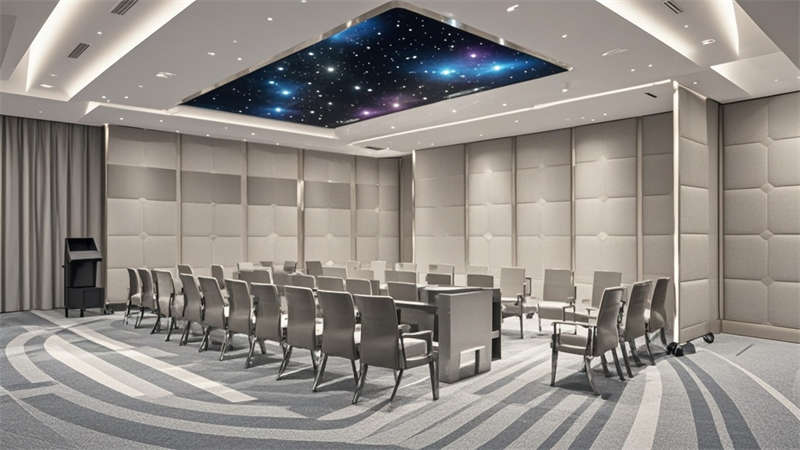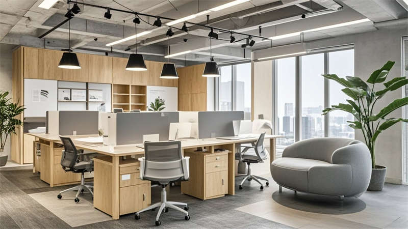 办公区采用模块化布局,配置智能升降桌和人体工学椅,裸顶喷灰工艺结合轨道灯系统实现灵活照明。色彩体系以高级灰为基底,搭配原木色系缓解视觉压力,局部采用深蓝跳色增强空间层次。材质运用注重环保性能,墙面大量使用穿孔吸音铝板,地面采用防滑地胶与静音地毯组合。