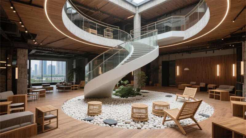 开放式核心区采用模块化家具系统,配合智能照明与声学优化,兼顾协作效率与专注需求;阶梯沙龙与透明会议盒子激发即兴创新,可移动隔断实现场景自由切换。最具特色的是贯穿三层的垂直生态中庭,旋转楼梯缠绕常绿藤蔓,成为连接空间的活力纽带。