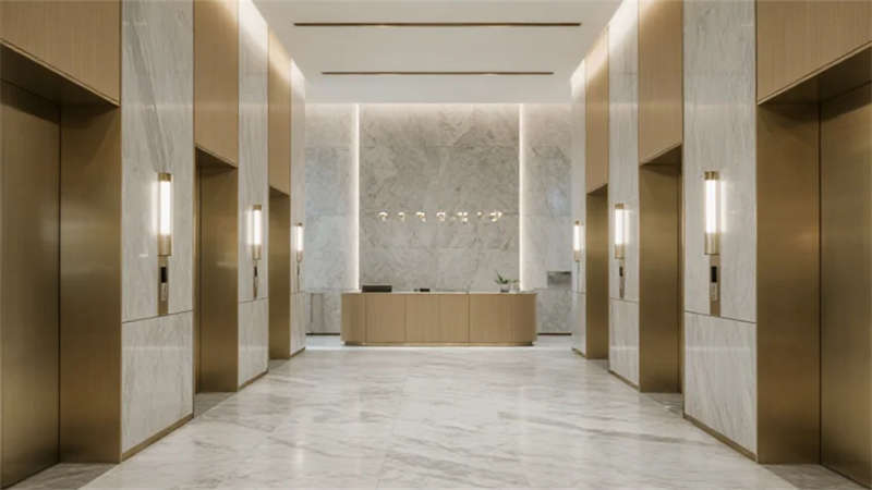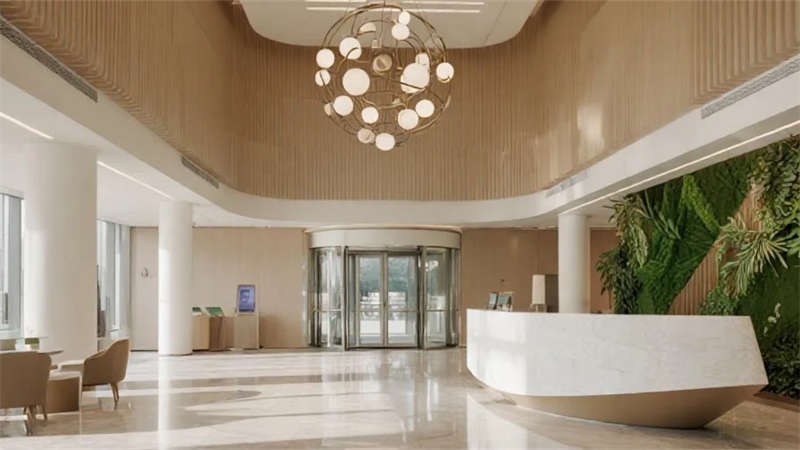 本设计以现代简约美学重构办公空间本质,建筑外观采用纯净的玻璃幕墙与几何切割形体,在昼夜交替中演绎光与影的韵律。入口大厅通过挑高空间与弧形前台营造开放包容的仪式感,绿植墙与球形灯具的点缀赋予空间自然生机。电梯间延续极简语言,香槟金金属与岩板材质碰撞出低调质感。
