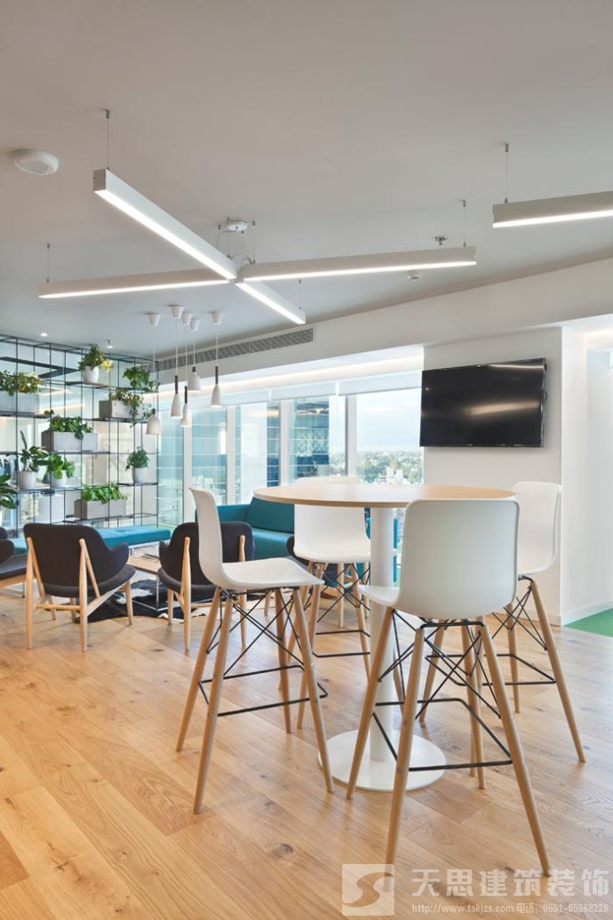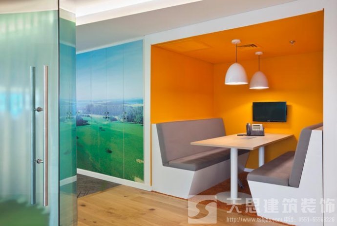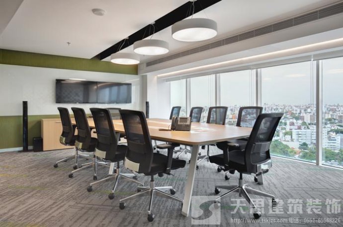 会议室的设计:设计师在设计的时候,将其安置在靠近窗户的空间区域中,在设计师看来会议是企业发展所不可替的,但是设计师希望可以改变会议室给人枯燥、无味的感觉,故此设计师将采光、室外景色通过设计的手法将其引入室内,让会议变得有趣起来。