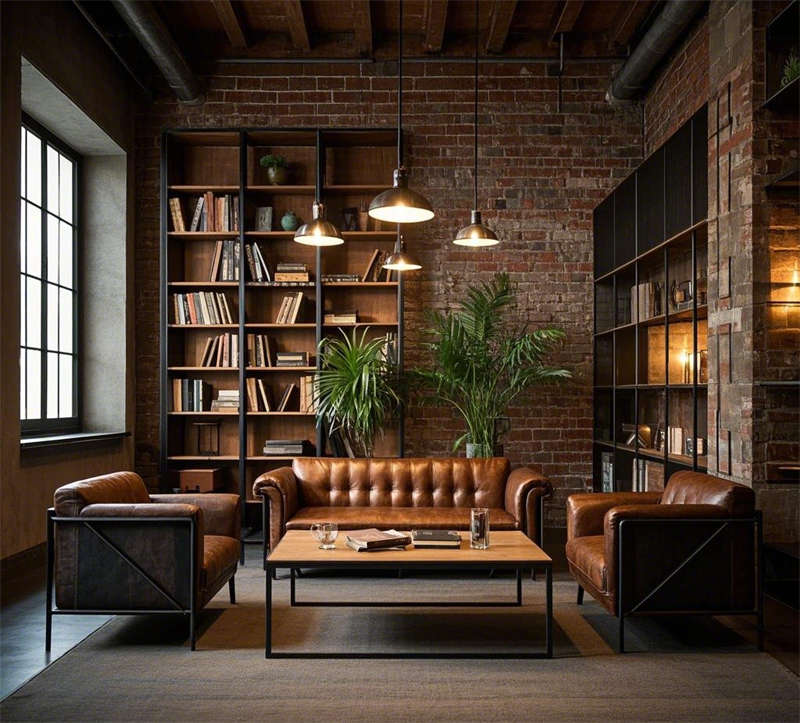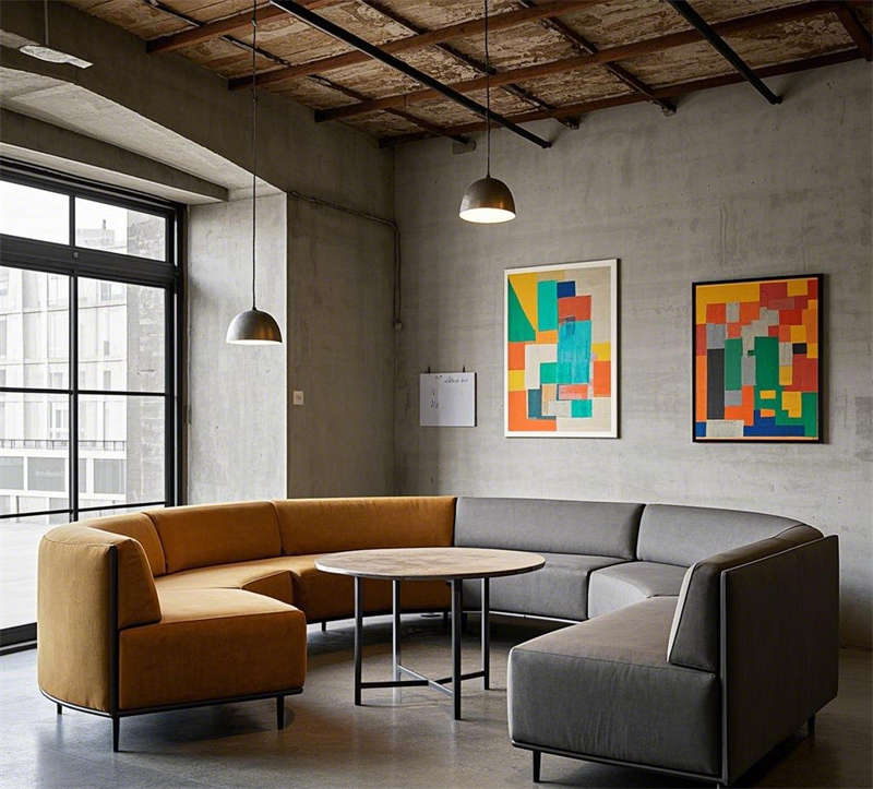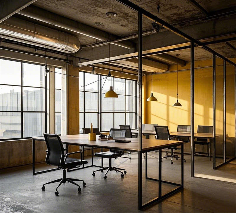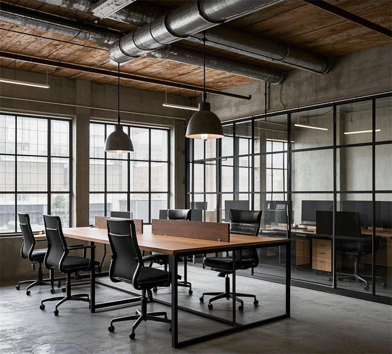 前台接待区以深色木质桌和皮质沙发为主,搭配暖色调灯光和绿植点缀,既保留了工业风的硬朗,又增添了温馨感。开放式办公区采用金属支架桌和玻璃隔断,既保证了空间的通透性,又提升了工作效率。会议室和经理办公室则通过深色木质家具和落地窗设计,凸显出高端与稳重。休息区和茶水间以舒适的皮质沙发和金属吧台为亮点,为员工提供了放松和交流的空间。创意讨论区则通过不规则家具和白板墙激发灵感,而电话间则以玻璃隔断和隔音设计保障了隐私需求。整体设计在保留工业风原始质感的同时,注重功能性与舒适性的平衡,打造了一个既实用又充满个性的办公环境。