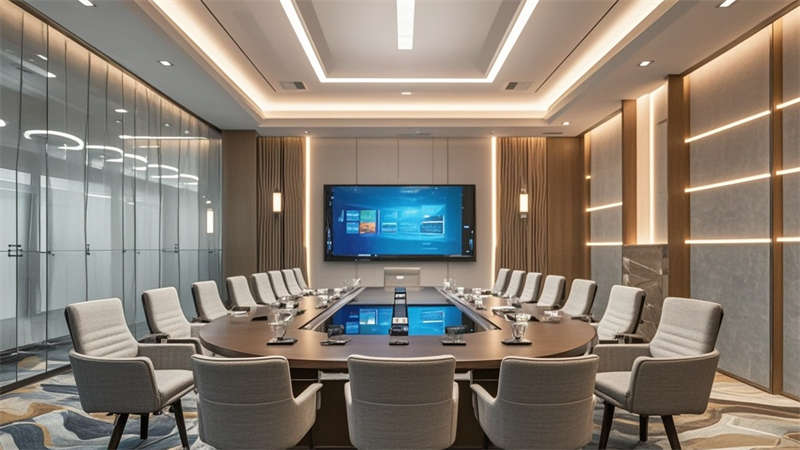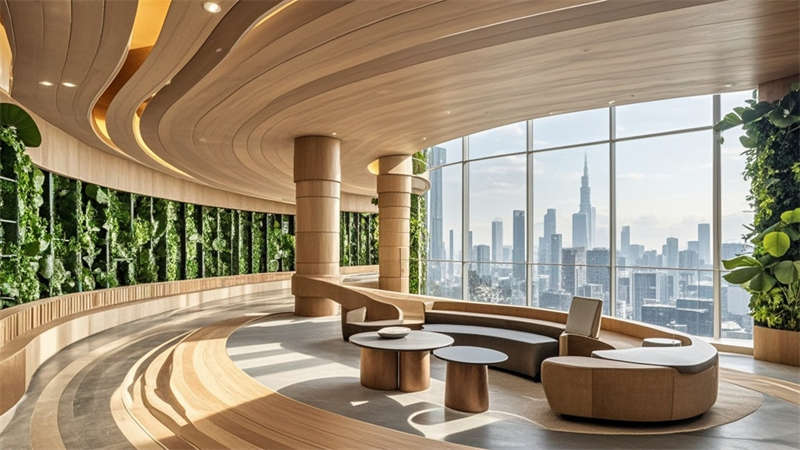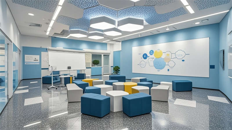 本1500㎡现代简约办公室设计以'高效协作·人文关怀'为核心,采用模块化空间布局提升使用弹性。主色调选用浅灰、白、木三色系,局部点缀企业深蓝色强化品牌认知。开放式办公区采用1.2m×1.8m标准工位模块,通过玻璃隔断实现90%自然光渗透率。智能照明系统根据日照强度自动调节色温,全年节电率达35%。核心筒改造区运用曲面木饰面弱化建筑结构,形成自然交流节点。声学设计方面,蜂窝吸音板(NRC 0.85)与隔音舱(STC 52)组合控制噪音污染。茶水区采用磁吸轨道插座系统,支持设备灵活接入。所有家具均符合WELL建筑标准,办公椅配备6向调节功能。通过BIM技术实现管线综合,保留3.2米净高营造开阔感。