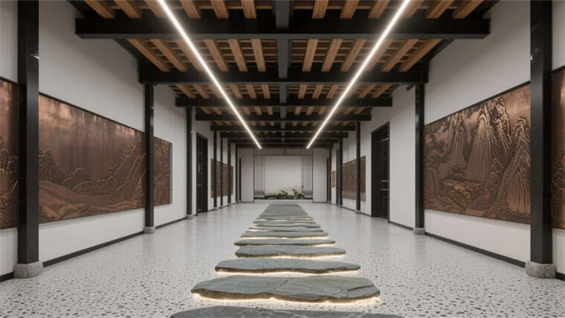前台大厅成为文化凝练的序章:层叠铜艺山形墙在光晕中起伏,夯土台面与悬浮木构的碰撞隐喻传统与未来的对话。纸膜艺术灯如空中浮云,柔化工业风的冷峻基调。