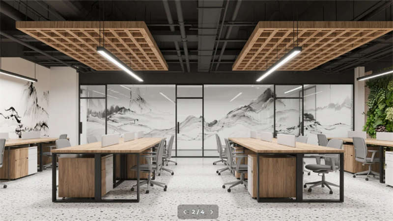 空间脉络延续山水哲学——开放式办公区的水墨玻璃隔断营造朦胧画境,创想实验室可书写墙面激发思维奔流。协作沙龙区的阶梯布局与动态山水投影,催化灵感迸发的化学反应。静思舱藏身绿植墙中,为深度思考保留秘境。