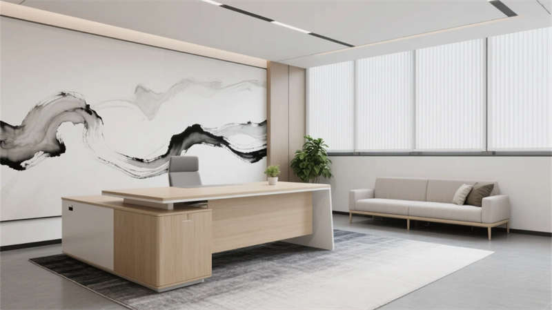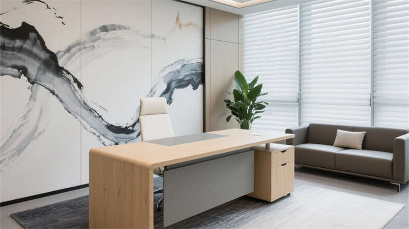 该设计以现代简约语言重构办公空间秩序,通过光影与材质的精妙平衡,营造滁州商务美学的当代样本。空间以浅木、暖灰与哑光白为主调,线性光带贯穿各区域,形成视觉连续性。开放办公区借落地窗引入琅琊山景光影,百叶帘调节自然与人工光的韵律;协作区弧形沙发与绿植墙柔化几何理性,激发团队创造力。