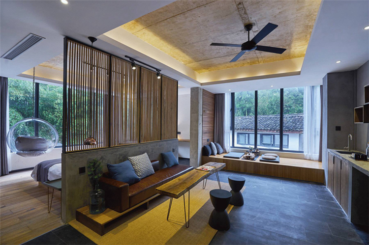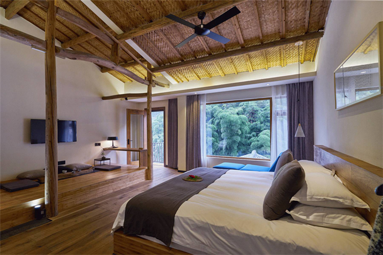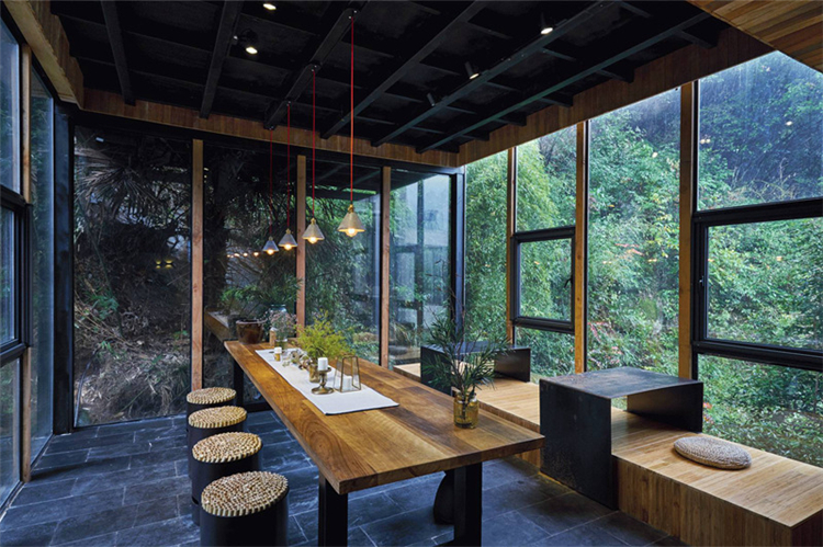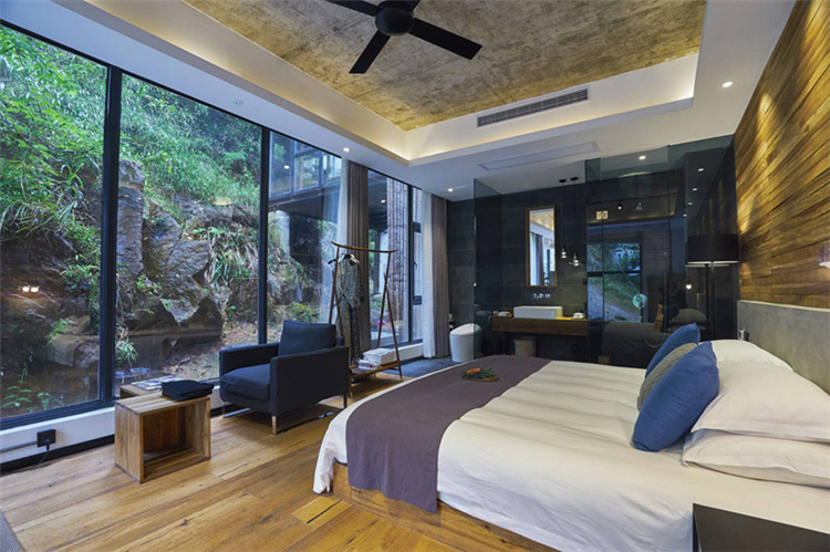 玻璃为墙、为窗,钢结构吊顶,木色为板,与周围环境相得益彰,仿佛置身山间之色;睡醒的清晨,清新的空气迎面而来,拂去懒懒睡意;用山间的宁静,洗去旅途疲劳,或者城市的浮华与躁动,体味另一番人生心境。