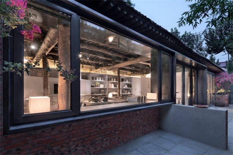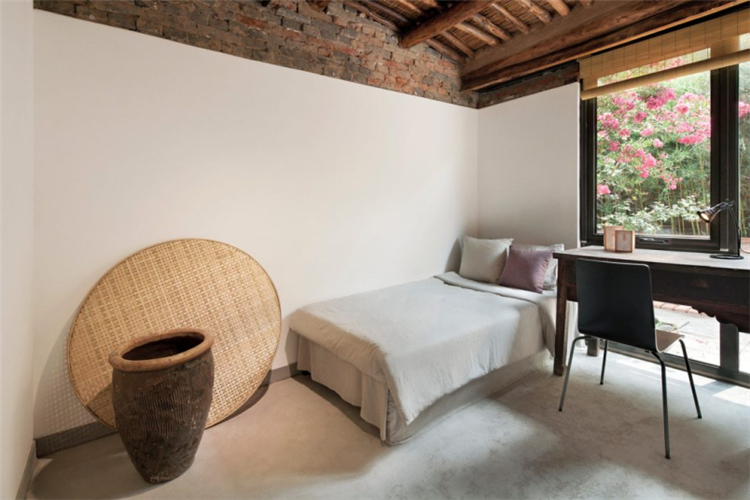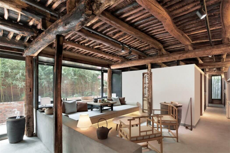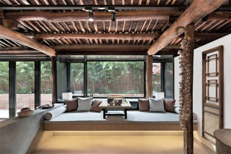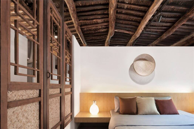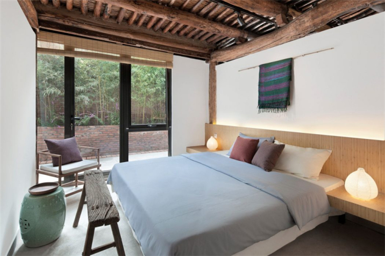 而我们在这次的民宿的功能布局方面,我们根据与居民的详细沟通,了解他们的日常生活和习惯,进行调整,重新组织平面图。在我们拆除吊顶后,更多的空间被释放,原始的木结构和稻草覆盖的天花板纹理终于显露出来,讲述了一个时间的故事。在现场勘察过程中,我们在建筑物西侧和邻近墙壁之间发现了一条约80厘米宽的狭窄通道。因此,我们在走廊尽头向西侧设计了一个观景窗。在窗外,摆动的竹影有助于将室内空间与自然环境相连。