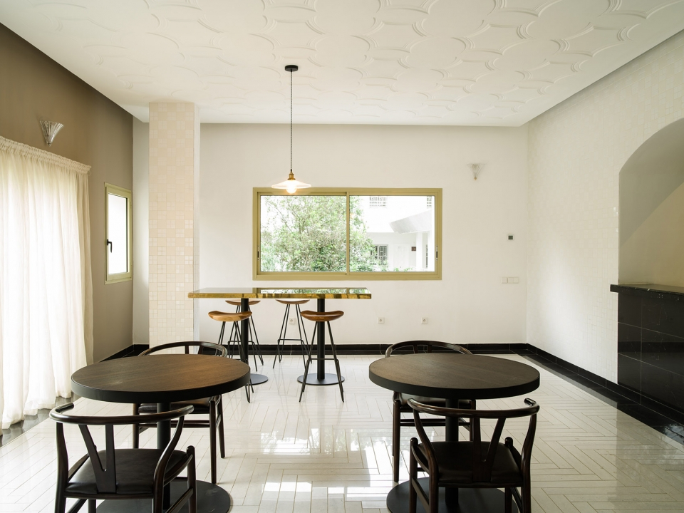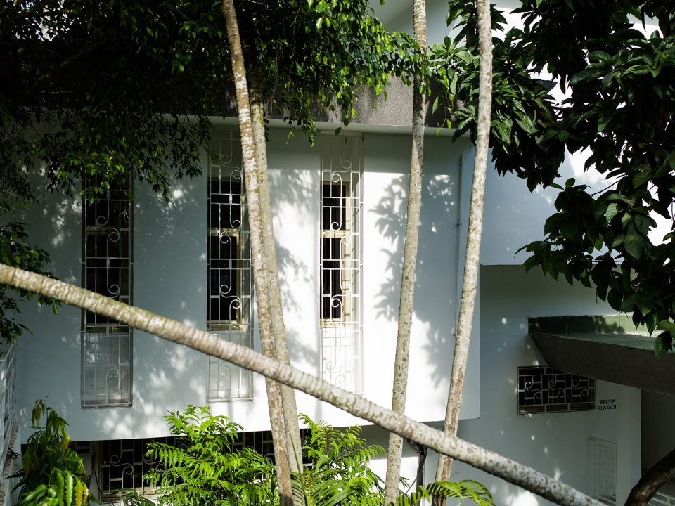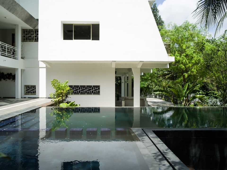 酒店外观局部,建筑在泳池中投下倒影,部分外部视图,池反射建筑物。健身房和养生区位于原建筑的厨房处,拥有良好的自然通风以及朝向。游泳池又长又窄,客人们可以在其中进行来回往复式的游泳运动,同时还在炎炎夏日里为客人们提供了一个消暑空间,当地树木的叶子和开花植物则为泳池空间提供了遮阴处和装饰。