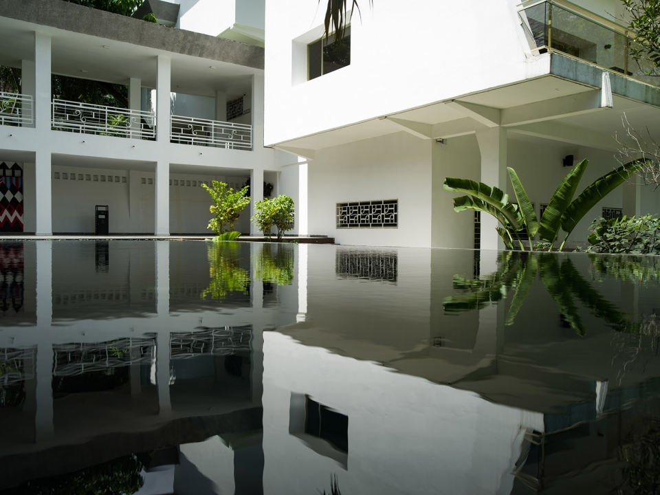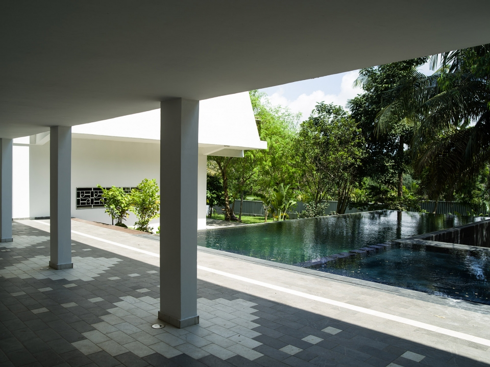 站在走廊上看泳池,室外狭长的泳池,棕榈树荫提供了遮阳空间。花园也充满了自然的意趣,给人一种放松之感,建筑师还在花园的地面上铺设了新的灰白两色图案的地板,不仅在室外空间中创造了一种视觉联系,更是将室外空间统一了起来。