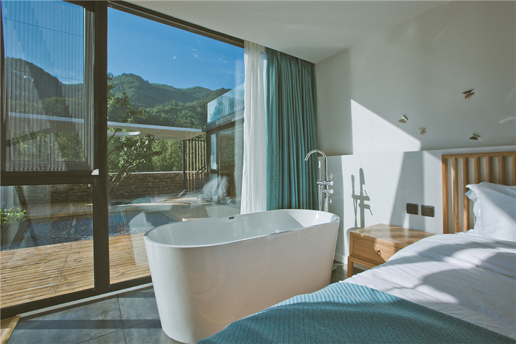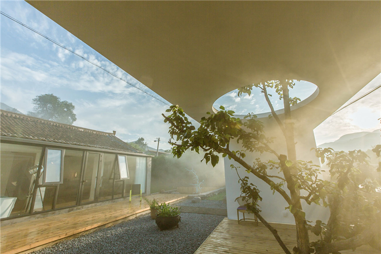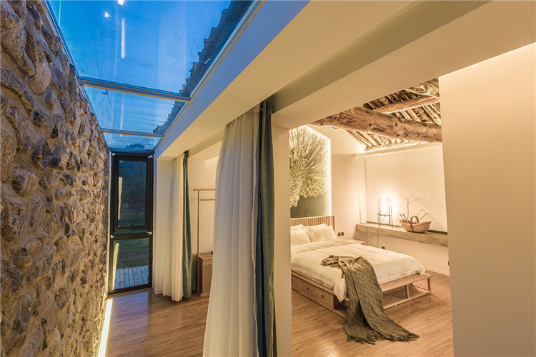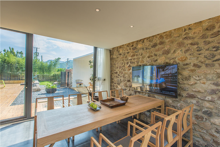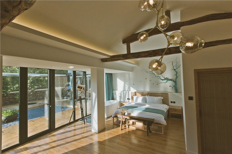 “随着越来越快的生活节奏我们每天奔忙,每天遗忘城市越来越近,乡村却越来越远”。这所名为“画框里”的民宿位于水泉子村,而名字寓意为将百里画廊的山水美景留在画中院中。可看到名副其实灵动的山水画这四季的变幻,凝集了我们对生活所有的向往。落地窗边放置了浴缸做一个泡泡浴一眼望去是院落的美景和远山的意境。主卧空间很宽敞,新中式的原木配灰色的简易家具些许的现代元素金属摄影灯使房间内多一份轻松感。