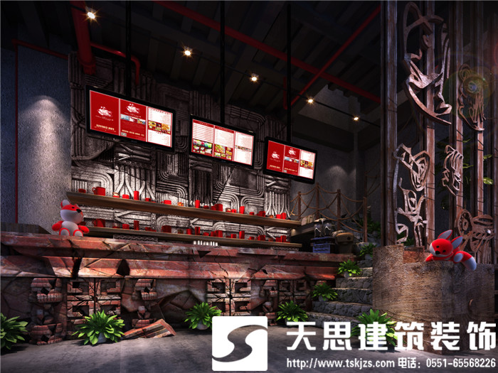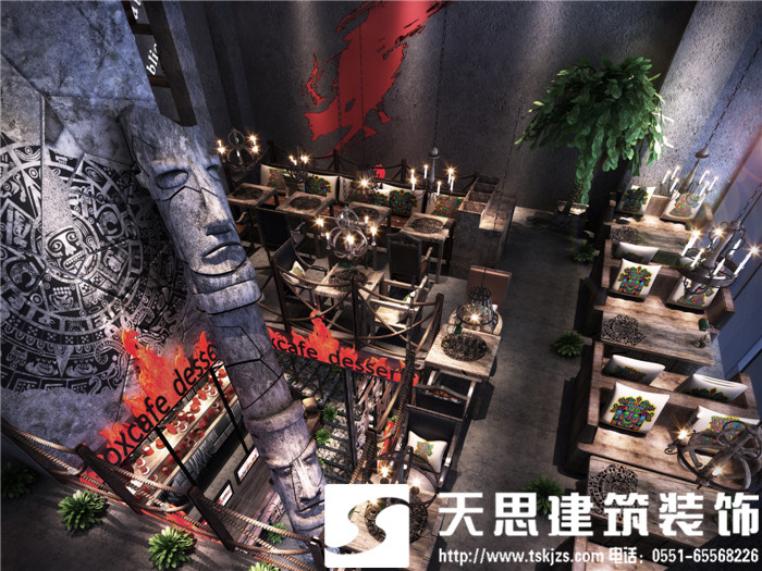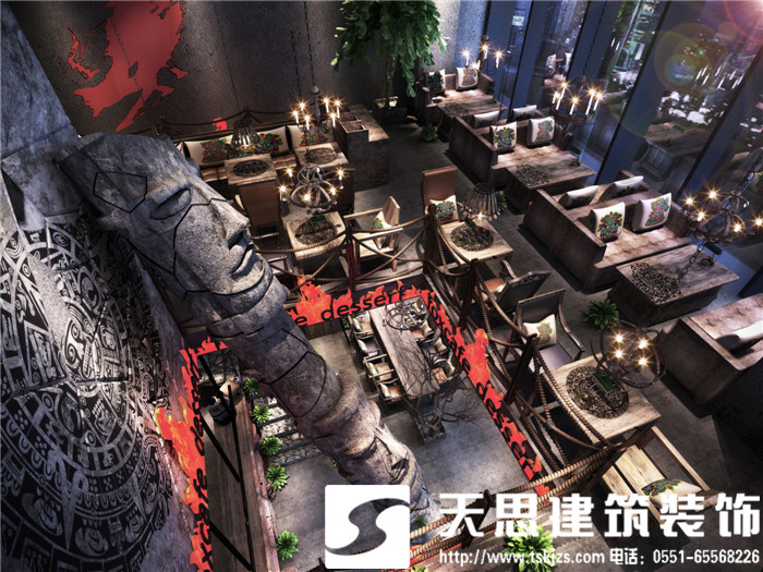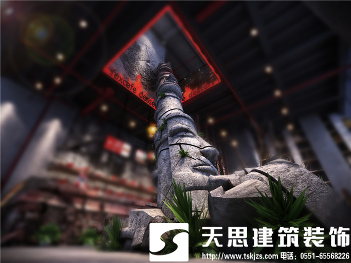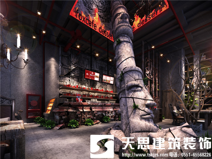 此案运用破碎的玛雅建筑纹理作为主元素贯穿整体空间设计,将消失的玛雅文化融入到设计风格里,用艺术化自然化的设计手法将简陋的空间置换为国际潮流空间设计风尚。仅用一根从底层直穿二楼的人面雕塑就巧妙规避了空间的局促感,成为整体空间设计最凝练的一笔。整体空间基调沉稳,清水混凝土、石头以及原木都为统一的暗色系,为了突出火狐的特色,将红色引入空间,不仅活跃了空间,也让品牌形象悄然流露。