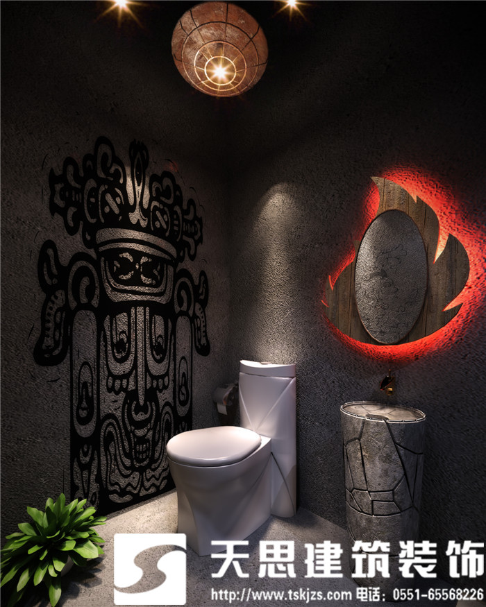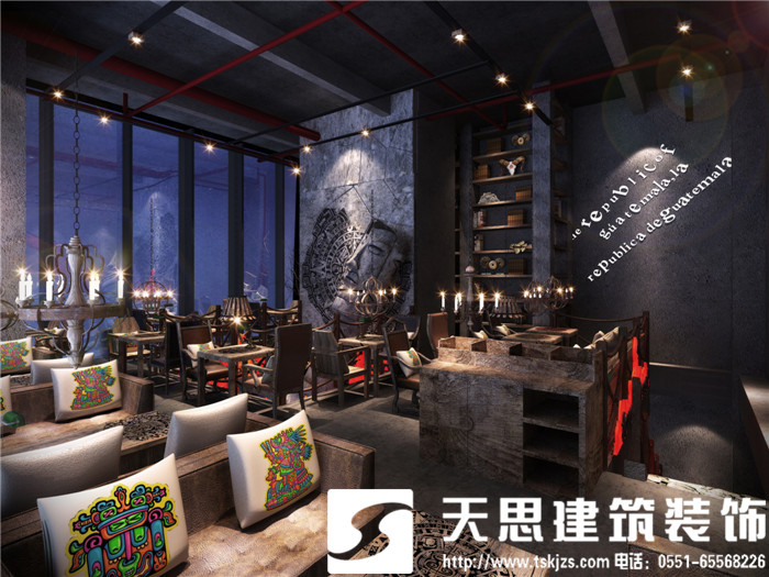 吧台处,由玛雅建筑纹理拼接的背景墙以及倾斜的人面雕塑敲碎的太阳历都展现着一种不可逆转的历史思维,形象精美的浮雕彰显出贵族气质和王者风范。所有素材原始自然没有冗余的修饰,在简约纯粹的大背景下,巧妙铺排空间,着力烘托出有内涵、高品位、精英范儿、国际化的精神理念。