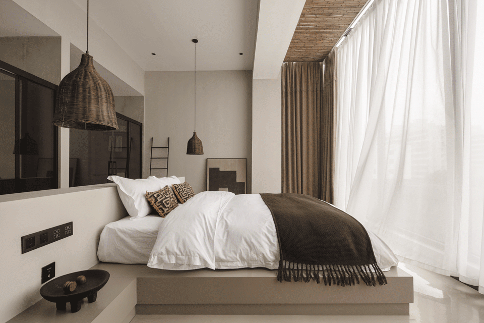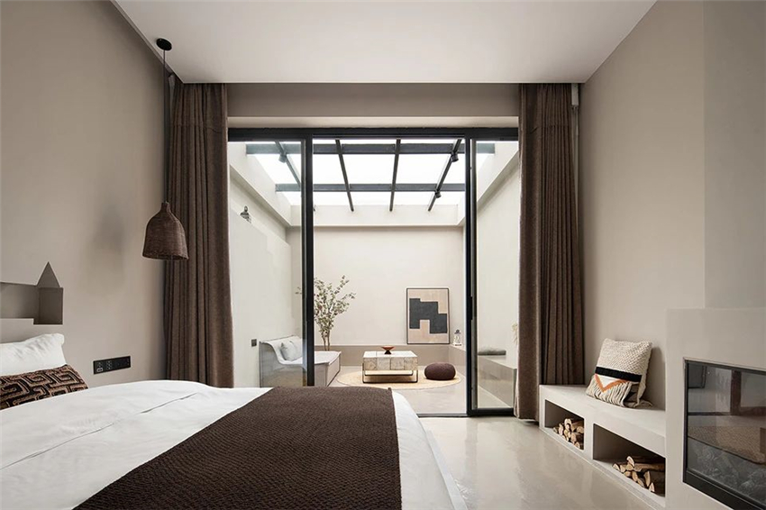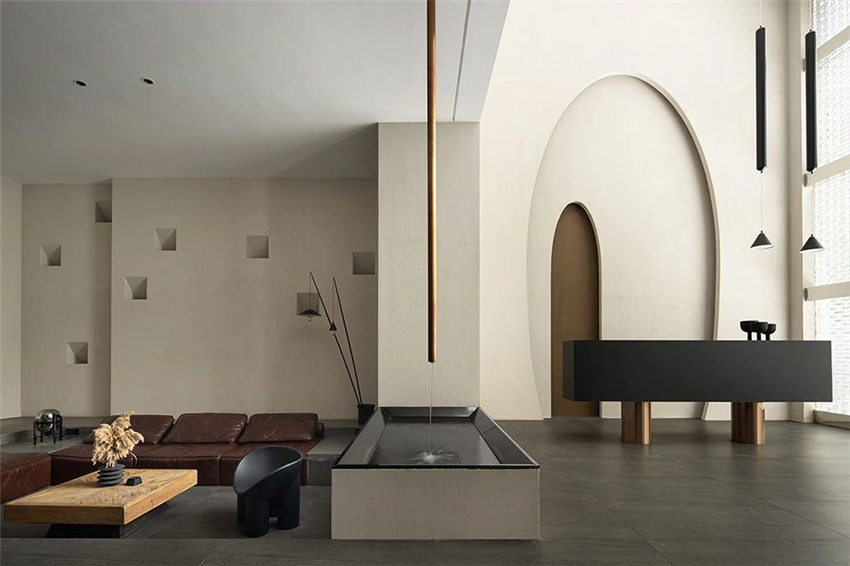 中性的色彩美学为基调,无彩色与暖调的咖色相互补充,一抹深色,使空间静默下来,将温柔缓缓释放。柔涓的水流坠落在水面上,荡起一圈小涡,我们喜欢这种流动性,有种轻盈的感觉。