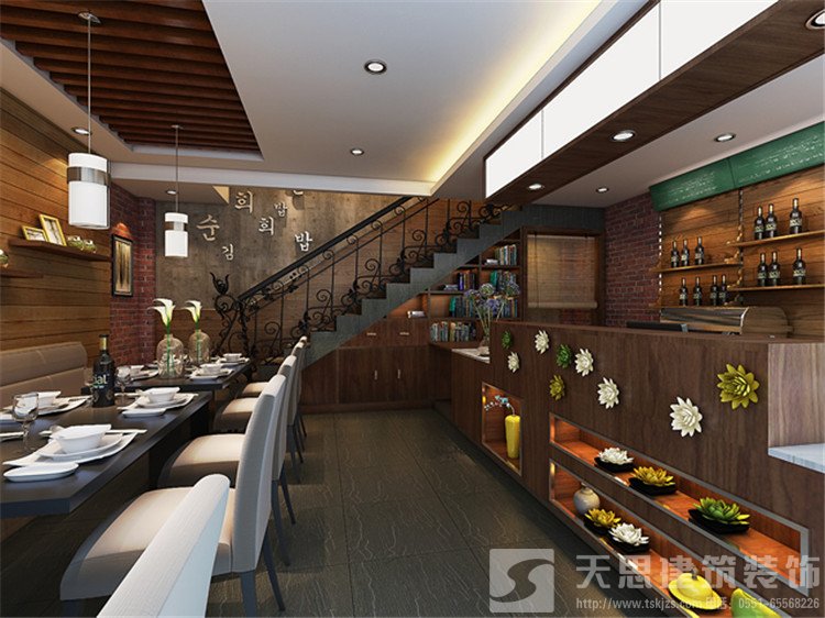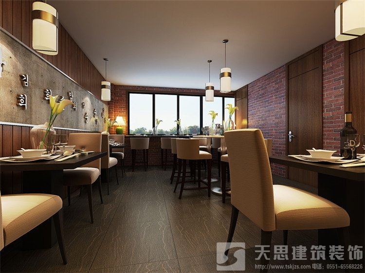 韩国紫菜包饭属于一家连锁店,在合肥目前有接近10家分店,在装修风格上结合了地域文化特点,韩国人的居住空间比较狭小,对空间的利用非常紧凑。席地而坐的生活习惯让他们呈现出一种低姿态的,贴近自然的生活形态,居室的设计所呈现出来的是小家碧玉式的精致,没有奢华和张扬。空间装饰多采用简洁、硬朗的直线条 ,反映出现代人追求简单生活的居住要求,迎合了韩式家居追求内敛、质朴的设计风格。