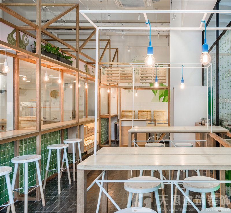 在室内空间结构上,我们倾注了大量巧思。玻璃间是包点制作区,制作人员在玻璃间内完成擀面、包馅和蒸制等一系列工序。玻璃间外的上部空间由木质框架勾勒,以墙上的品牌标志为背景,摆放着盆盆绿植,枝条垂坠而下,清新可人。空间下部加入了吊灯和座位,一方面使得整体结构更为完整,另一方面便于食客观察了解制作过程。玻璃间上部兼具玻璃与木头两种质感,下部的墙体由手工抛光的绿色瓷砖铺就。店外,玻璃间的一面正对街头,外延的木质搁板既为顾客提供便利,也使得店铺内外更为浑然一体。