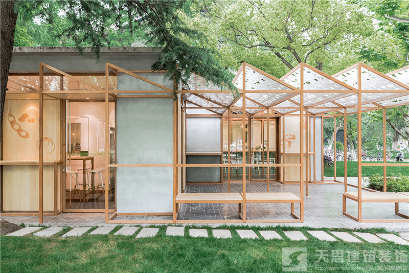 同样运用木材和绿色系,再结合可爱的镂空图案棚架,打造出一个清新温暖的包子铺。尖角状的温室结构一直延展到室外空间,同时有两面是被经过镂空图案效果设计的可滑动木面板所围合。