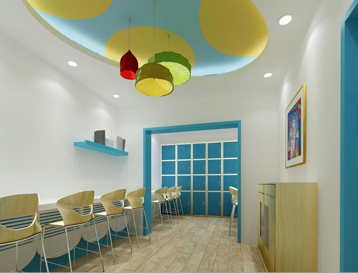 前台大厅的设计:阳光透过大门射入室内,让人感觉到温馨与温暖,设计师希望阳光可以无处不在,让孩子在这样的环境下可以健康、快乐的成长,在其中设计师采用了阳光、色彩之间的相互交融,设计师希望展现在孩子面前的是一个五颜六色的世界。