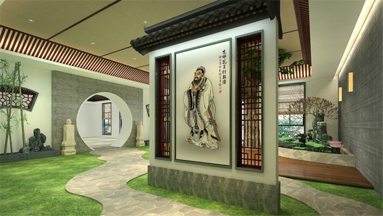 书法教育培训机构进门区设计:文化的脉络是字体,字体的脉络是书法,书法的脉络中隐藏着传统的中华文化,通过对字体书法的研究,进入传统文化的世界。至圣先师的画像伫立在庭院的正中央,为空间增添了庄重之感,自然的景色更显书法的飘逸与自然。