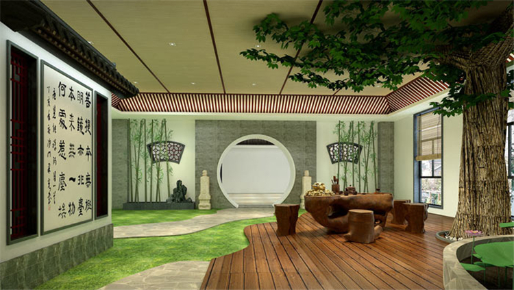 书法教育培训机构庭院设计:菩提本无树,明镜亦非台,本来无一物,何处惹尘埃,四局偈语表现的即是书法也是道理,表示书法的博大精深。