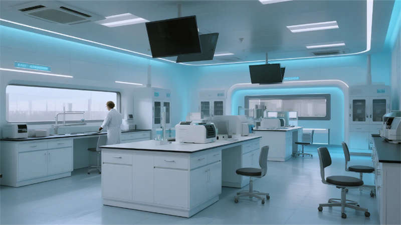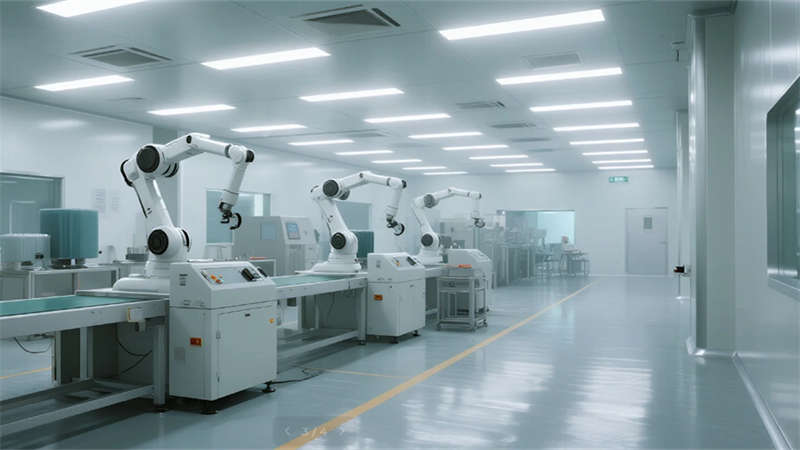 生产空间聚焦高效与洁净,智能机械臂单元与模块化管线系统满足精密材料制造需求,冷色调照明强化科技严谨感。研发区域突破传统厂房格局,落地窗引入自然光与园区景观,垂直绿墙净化空气的同时激发创造力。