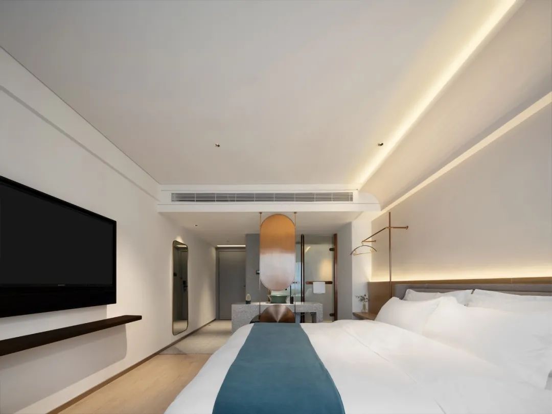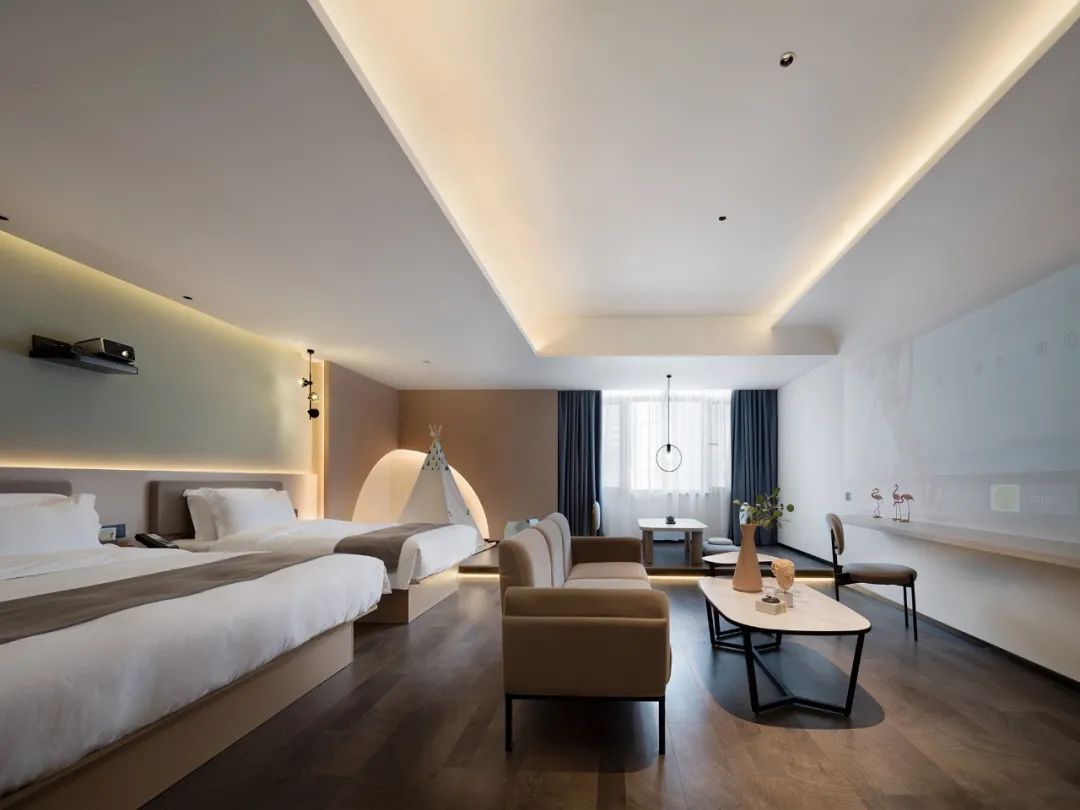 在线条曲度与建筑结构的衔接中交融出感性层面的惊喜,令入住者“循着光”下榻酒店,在体验与感受中为空间注入当下的即时形态,由此,人在空间里是造访者亦是着境者,是观赏者,亦是参与者。情与境中,无尽遐思。