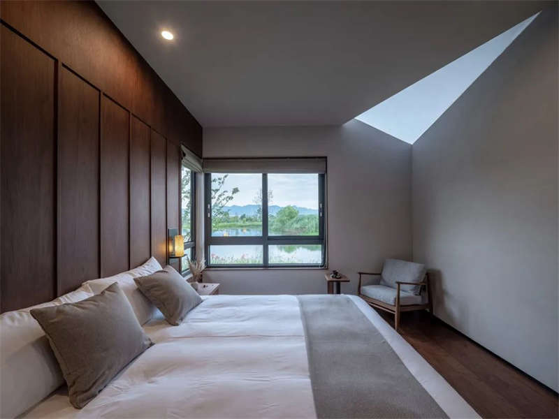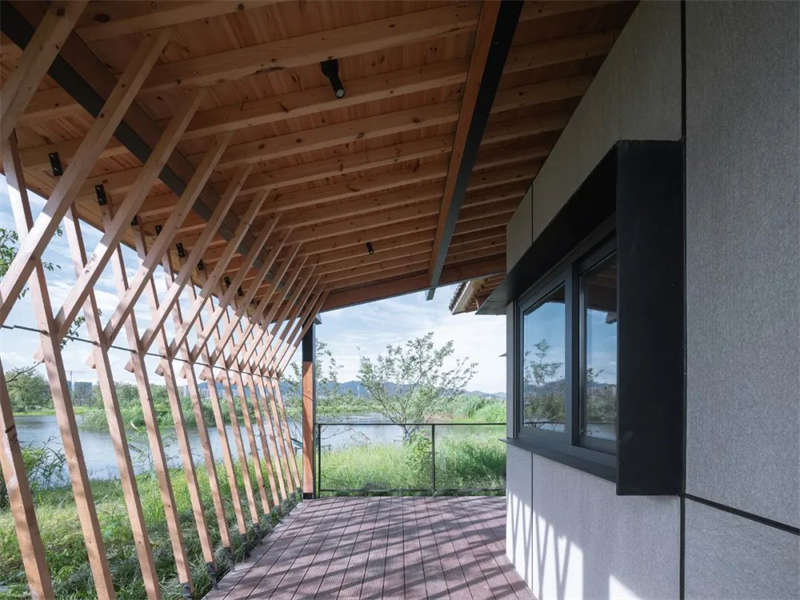 湿地生态酒店由两个客房类型有机打散分布组成,都是运用了在大屋顶下生活的概念,大屋顶也像是翅膀,如小鸟般栖居于此,在岛上停留片刻,轻轻落在水面上。古人造物很喜欢因地制宜,轻巧的介入自然,用木头把房子架在水上,房子被自然融入与包裹,这种生态观念在中国人的骨子里就一直存在。很多人会说这两个房子很有江南的味道,这种江南性一方面在于对房子虚体空间属性的理解,放大檐下空间的比例,连接人居空间与自然天地,同时通过对尺度的把握创造怡人的居住空间,皆是营造一种人、空间、自然三者之间的关系。