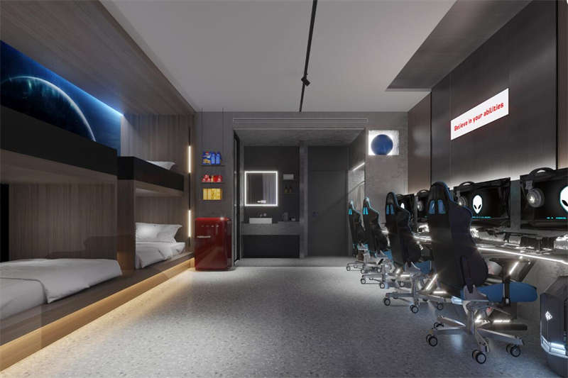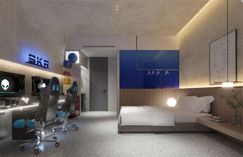 相信很多电竞酒店投资人在筹备设计时,都会思索如何将电竞元素和入住体验完美融合。一方面需考虑符合电竞爱好者审美,增加潮酷元素;另一方面则需考虑睡眠质量,减少炫目元素。
