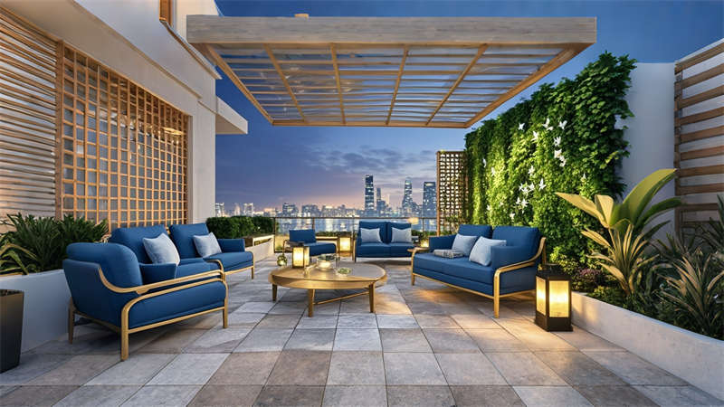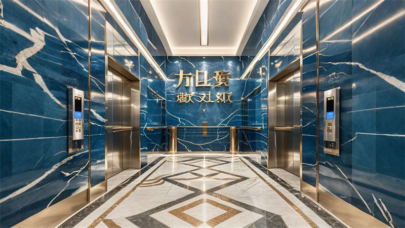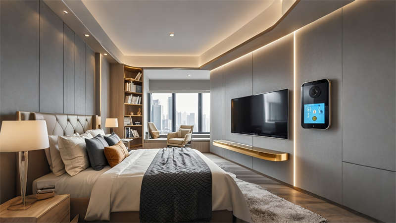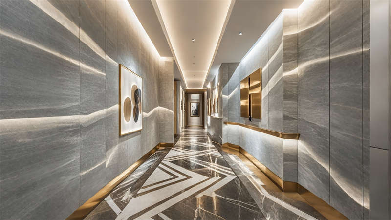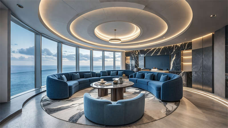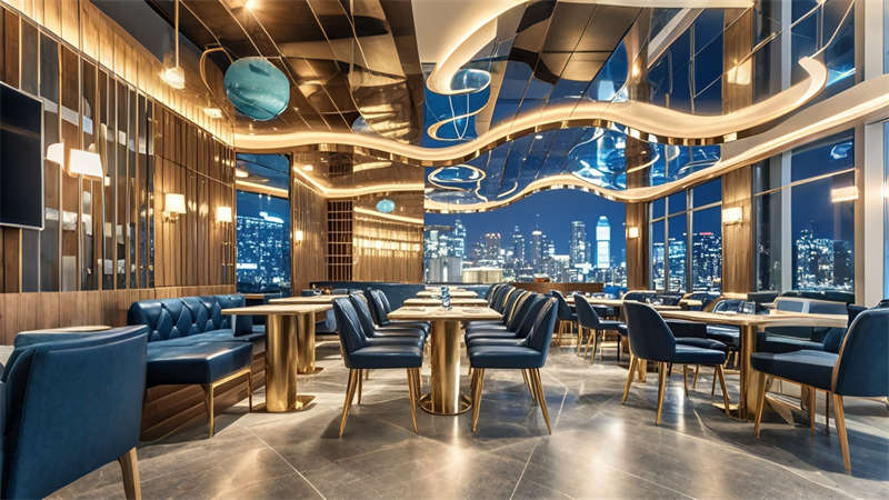 色彩体系以香槟金与深海蓝为主调,大堂采用香槟金金属线条勾勒建筑肌理,搭配深海蓝大理石营造视觉重心。客房区运用暖灰硬包墙面平衡色彩强度,通过2700K暖光与4000K中性光分区照明塑造昼夜场景。材质组合注重层次:大理石地面、金属构件、绒布软包形成质感三部曲。