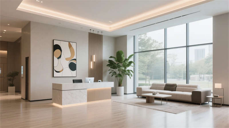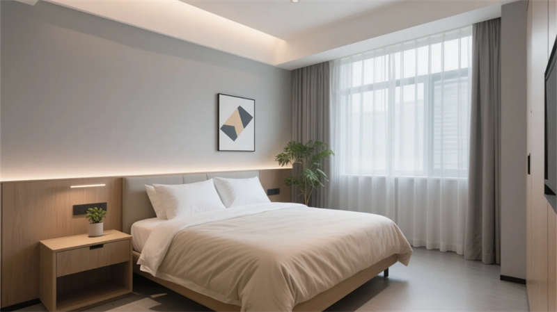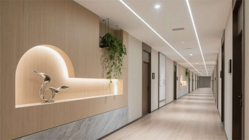 酒店以现代简约美学贯穿始终,走廊作为串联各区域的纽带,延续了整体的设计语言。弧形壁龛与悬浮天花板的线性灯光,柔和地引导动线,浅木饰面与石材的碰撞在低调中彰显质感。壁龛内的艺术摆件与垂坠绿植,将自然气息融入过渡空间,打破传统走廊的单调感。