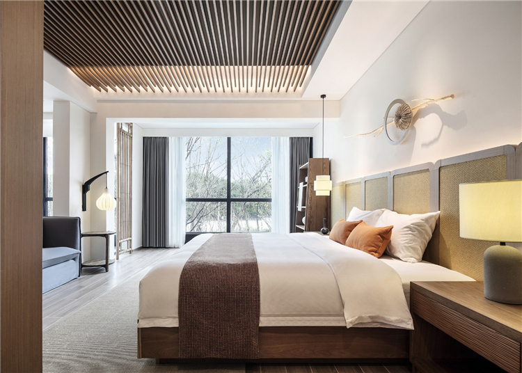 客房布草装饰选用棉麻材质,色彩过渡柔和,给人暖意。床头的实木雕画回归原野古朴,竹编吊灯造型各异,一花一草一木皆入景,简而裁,巧而自然。竹藏风雨,触及野趣,山居生活隐逸悠然,静念生长。