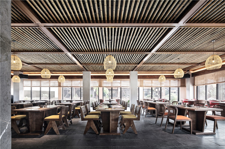 九华当地多竹木,设计就地取材,空间中运用较多原木家具和竹制吊灯,及一些土陶制品,表达对本土文化的致敬和延续,净土在禅,于自然质朴之中,敛去了浮华气息。