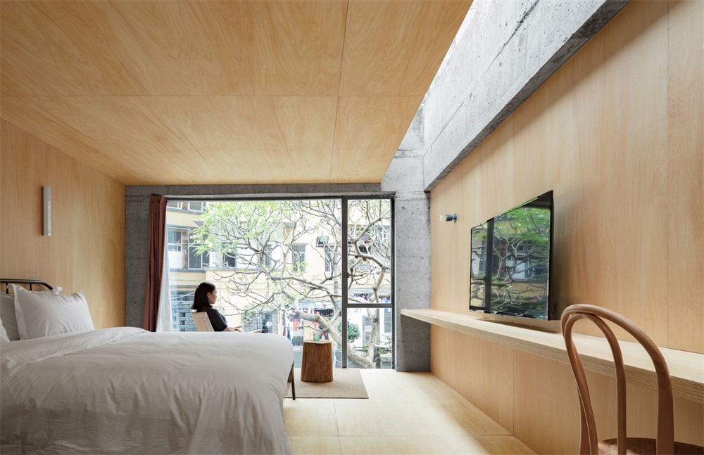 建筑四周围绕着老式居民楼,为了使其呼应周围居住环境的氛围,特意保留了原有立面具有历史质感的青砖。此外,在外立面的门窗的位置和进深的设计上,结合整个建筑比例和室内布局以数十厘米为单位进行了微调,使得室内视野开敞且采光充足。金属窗框的更换和进深的加深则为民宿增添了空间浸入感。