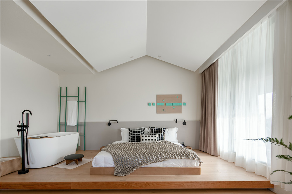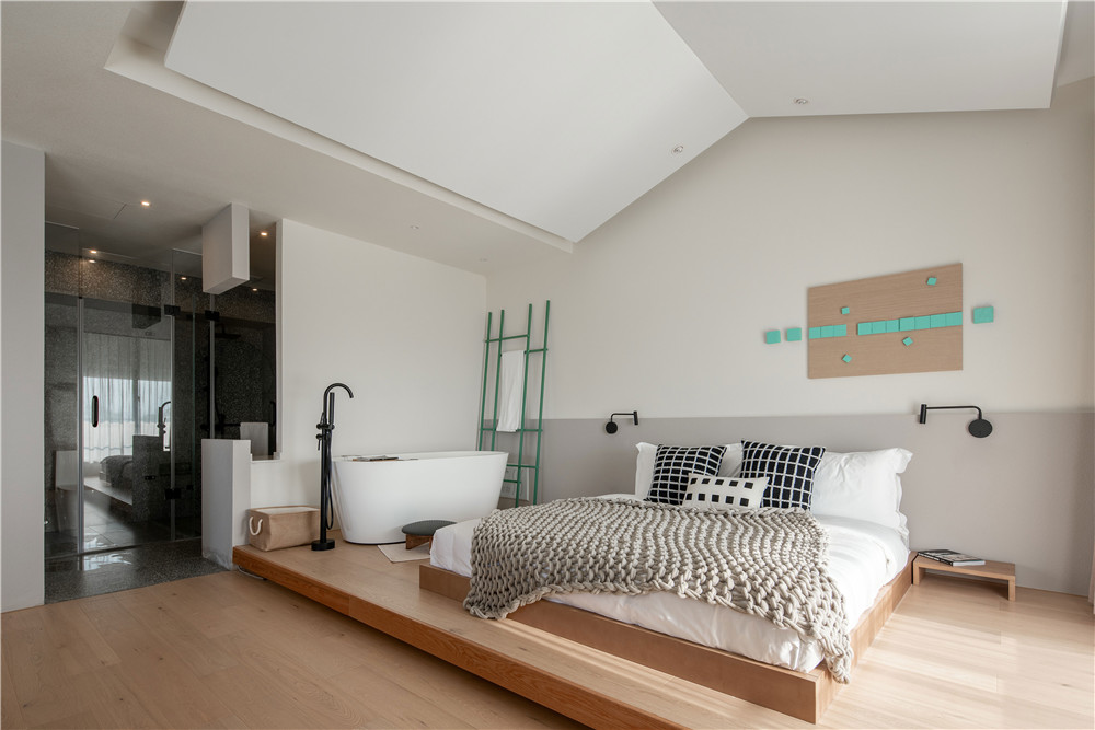 设计师一直在思考如何营造空间的秩序、空间的关系、空间的情感,最终打造了一个“无限艺术空间”,整个空间运用简单的方形,相互叠加、构筑,空间的关系或敞开,或闭合,达到一种无边界的空间状态。推掉原有的墙体,又新建新的墙体,用“不完整”的方形划分空间界限。同时在色彩上,回应对“艺术”的思考,设计师运用了白色,这种无色的颜色,也在述说着空间情感,更纯粹,更真实,且没有边界,为每一位到访者留下无限的想象空间。