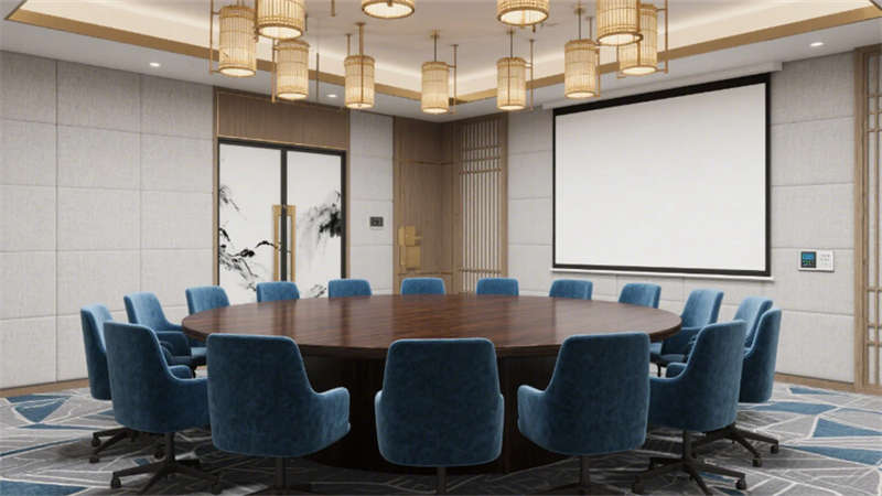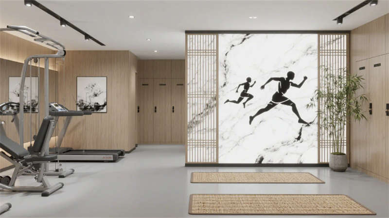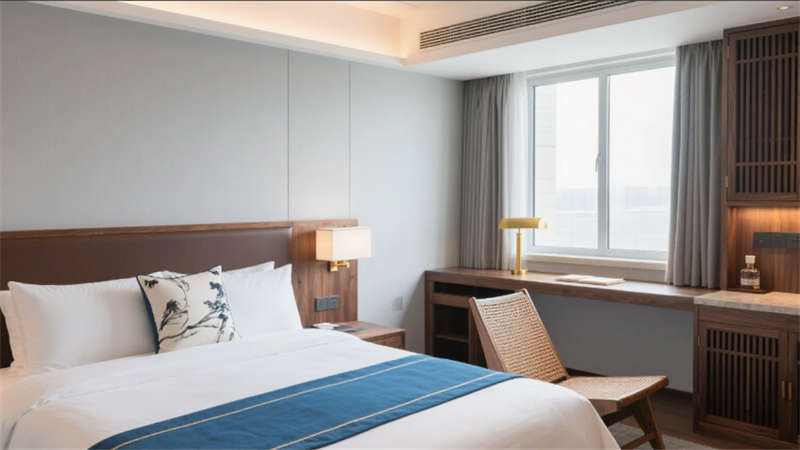 客房区域以“去符号化”手法诠释东方美学:深木纹床头背板嵌入隐晦的水墨纹样,藤编躺椅与迷你吧木格栅柜体,在3000K暖光中营造居停的松弛感。套房通过丝绒沙发与抽象水墨画提升奢华调性,浴缸区的竹艺卷帘巧妙平衡通透与私密。公共空间亦贯彻统一语汇——健身房竹编地垫与水墨运动壁画、走廊绢丝灯箱与枯山水景墙,皆以现代材质转译传统元素。