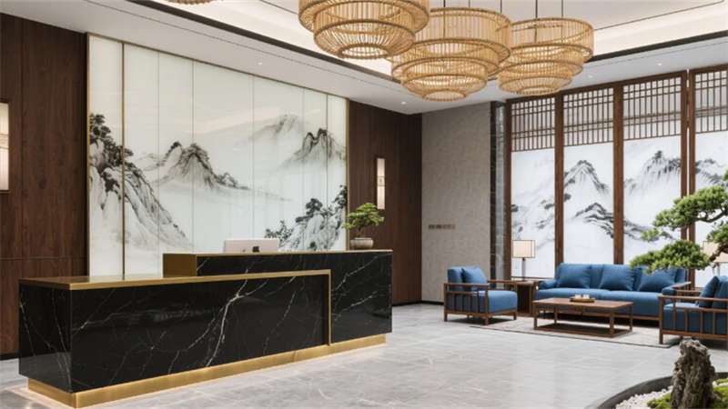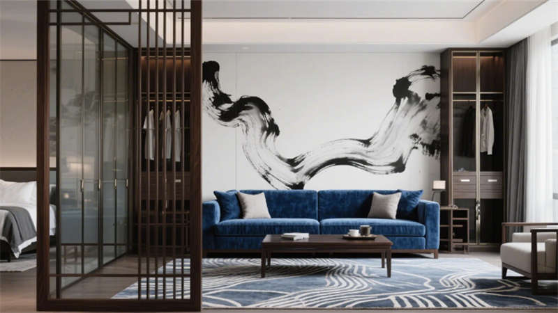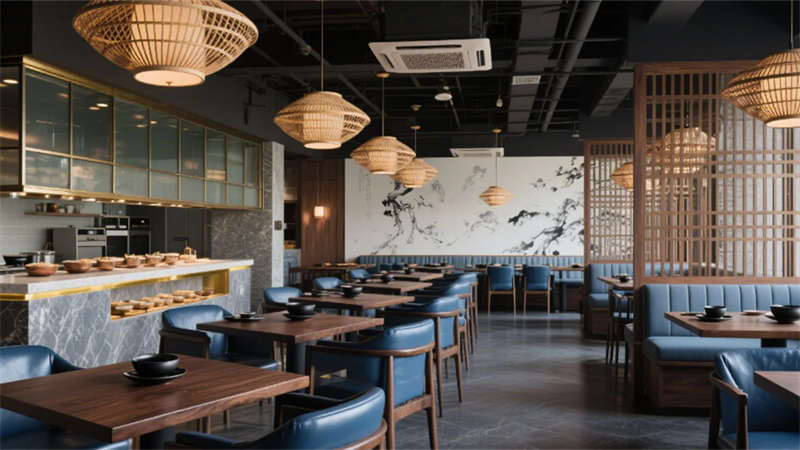 步入大堂,深胡桃木墙面与浅灰石材地面构成经典东方底色,水墨艺术玻璃屏风似山峦叠嶂,悬浮竹编吊灯以编织肌理软化空间。靛蓝色沙发与黄铜细节的点缀,既延续外立面色彩逻辑,又激活视觉层次。餐饮空间延续木格栅语言,竹编灯罩与黑陶器皿在开放式厨房的金属框架中碰撞,演绎“新旧共生”的餐饮仪式。