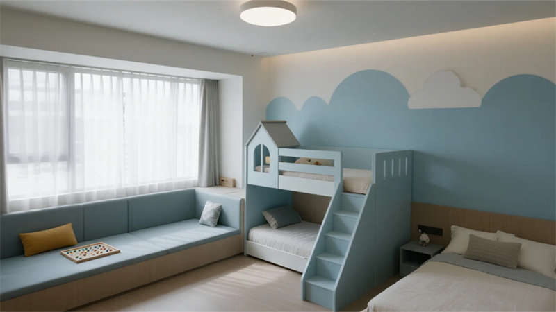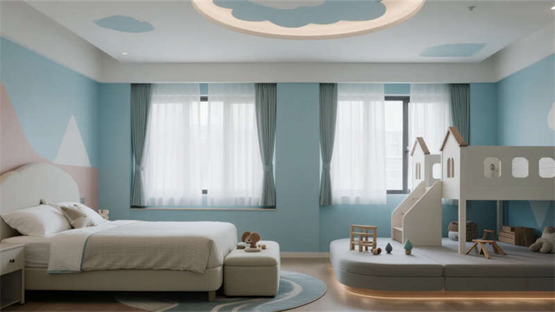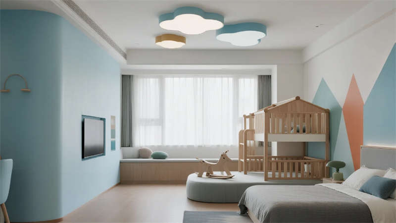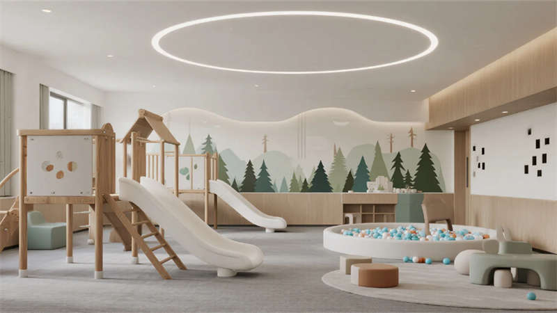 公共区域强调功能与美学的平衡:开放式游乐区释放孩子天性,阅读角的树洞书架激发想象力,手工坊的彩虹收纳系统培养创造力。户外庭院融入沙坑与绿植,让自然成为游戏场;夜晚的星空影音室则转为家庭温馨剧场。整体设计通过流动的空间布局,让家长与孩子在简约美学中共享亲密时光,重新定义合肥亲子度假的体验方式。