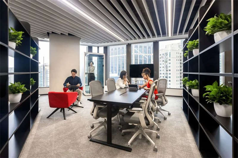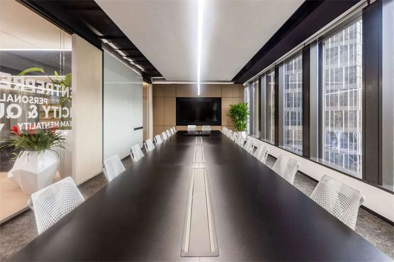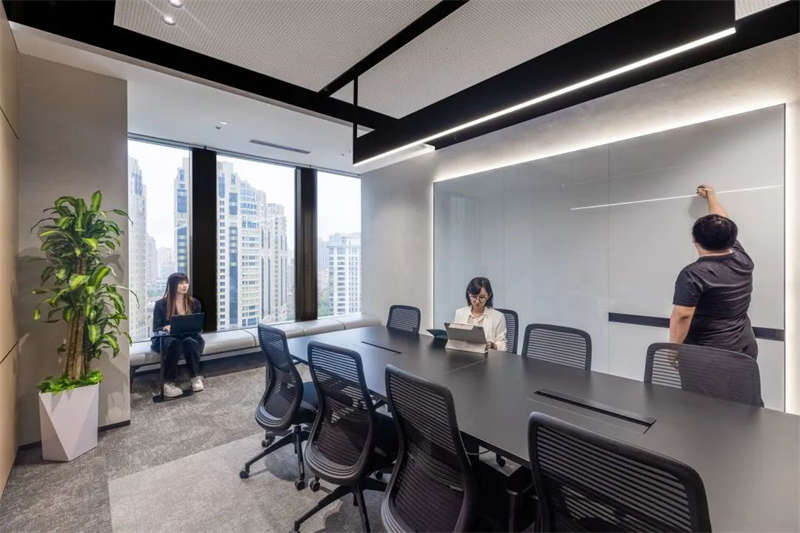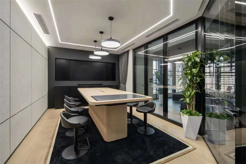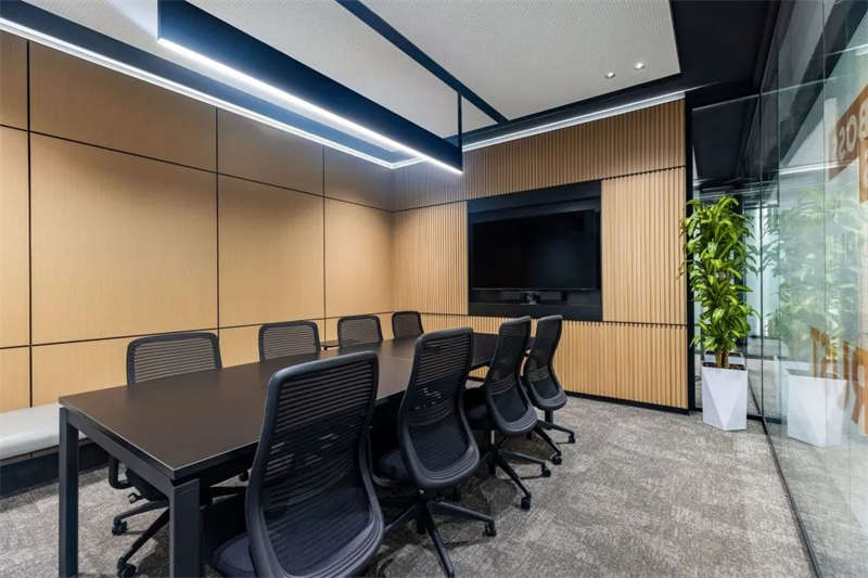 所有的会议室中,电视屏背景墙均以纵横相交的竖条黑色U形槽做了分块处理,在电视屏幕安装位置上保持了统一原则,电视屏垂直居中,上下线条与背景墙上部、底部的距离相等。诸如此类的设计,使得办公空间视觉条理性得到了加强。