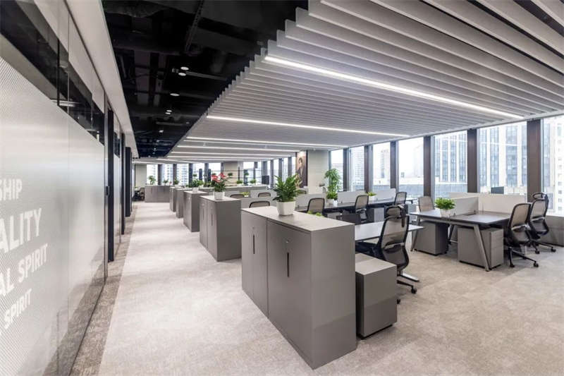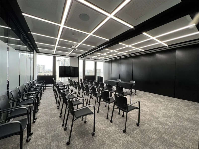 前台区的两条灯带从吊顶延伸至侧墙体底部,光源自上而下具有连贯性。培训室纵横灯带分割出的块状吊顶间,在施工时做了整齐对接的处理,以此增加空间的秩序感。齐整化的处理,凸显出办公空间严格的秩序性。