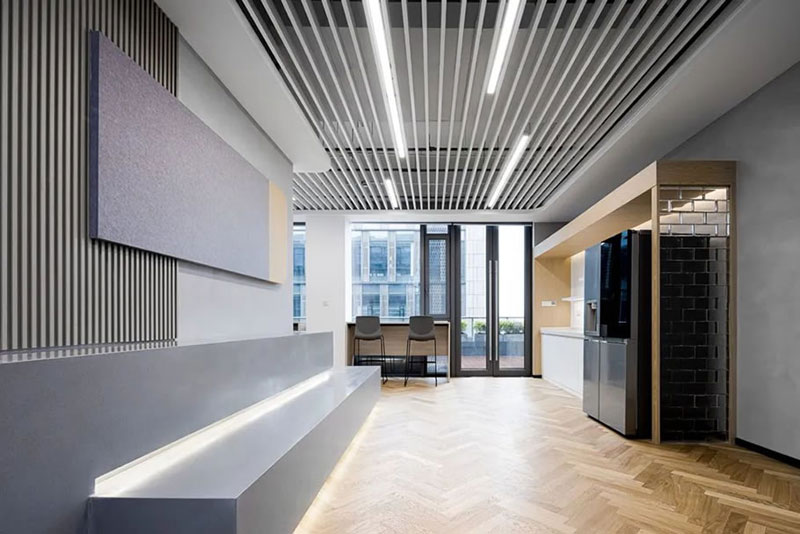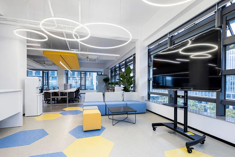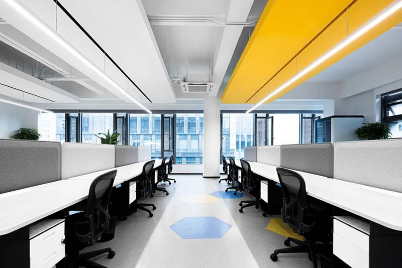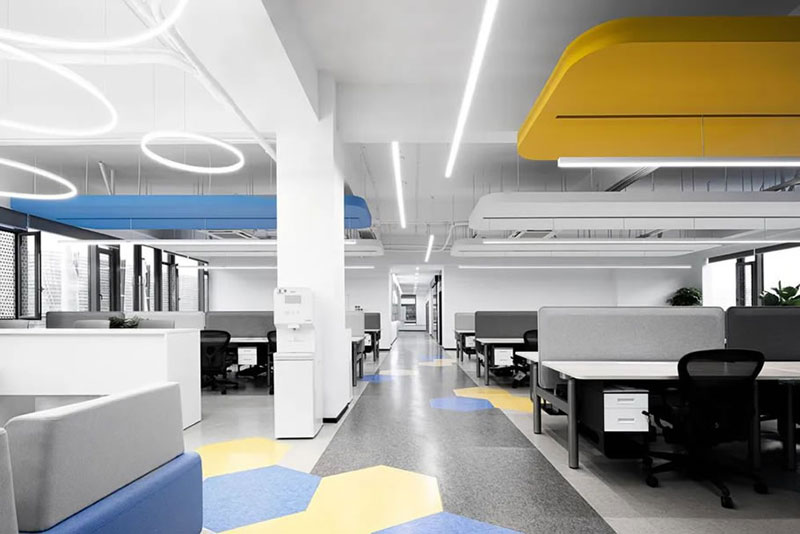 开放工位的造型吊顶与地面色块相互呼应,轻松有趣的气质穿梭在人员协作之间,中性色彩办公家具在细节上增加耐用和降低视觉刺激导致的疲劳感。真正舒适的空间做到与功能需求一致,提供给使用者专心的设施和敏捷的思路。